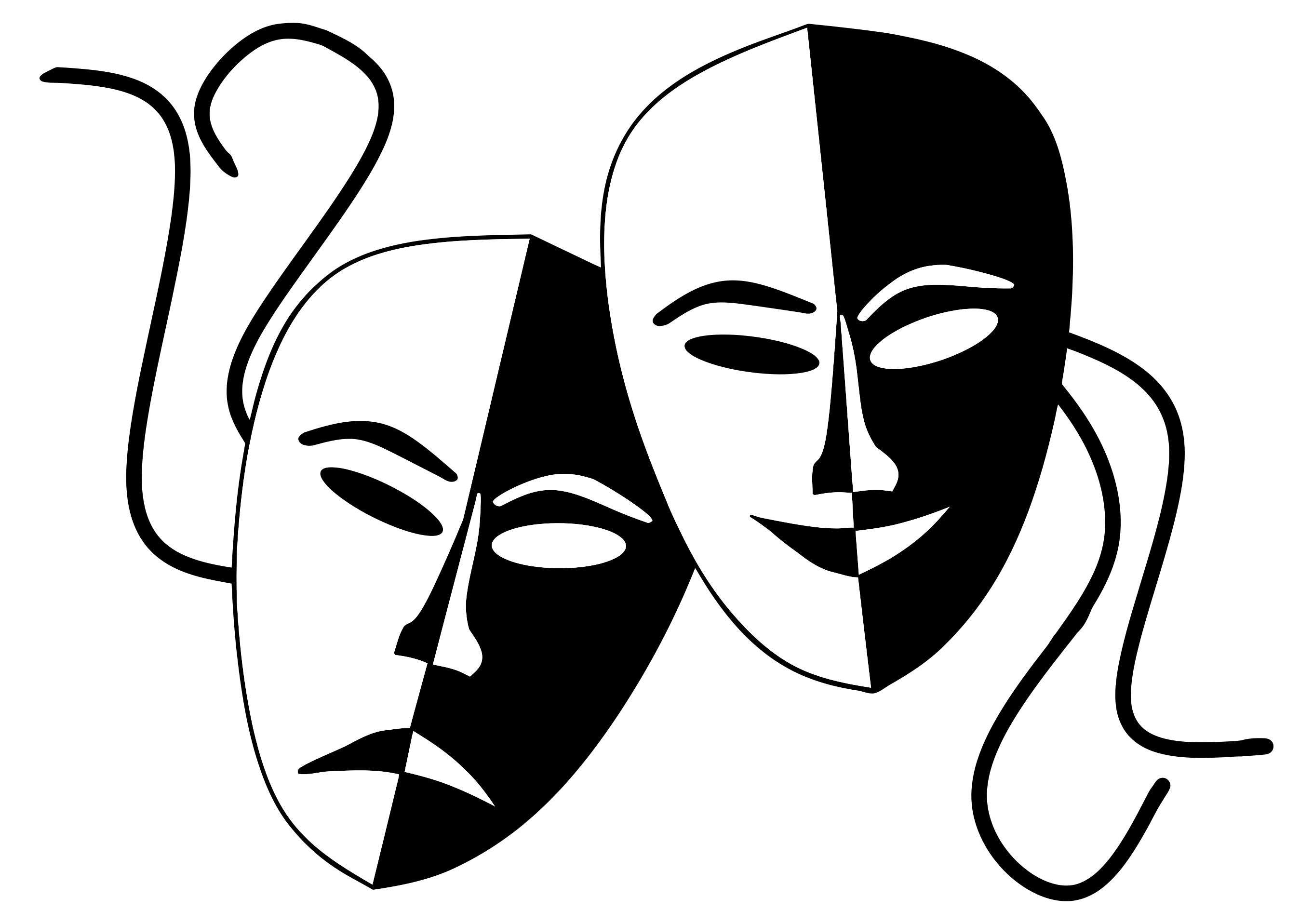 This features a black and white illustration of two theater masks, each representing a different emotion. On the left side, there is a mask symbolizing tragedy, while on the right side, there is one representing comedy. These masks are placed next to each other, creating an interesting contrast between the two emotions. The artistic representation of these masks adds depth and intrigue to the image, making it visually appealing for viewers who appreciate theatrical elements in their surroundings.
