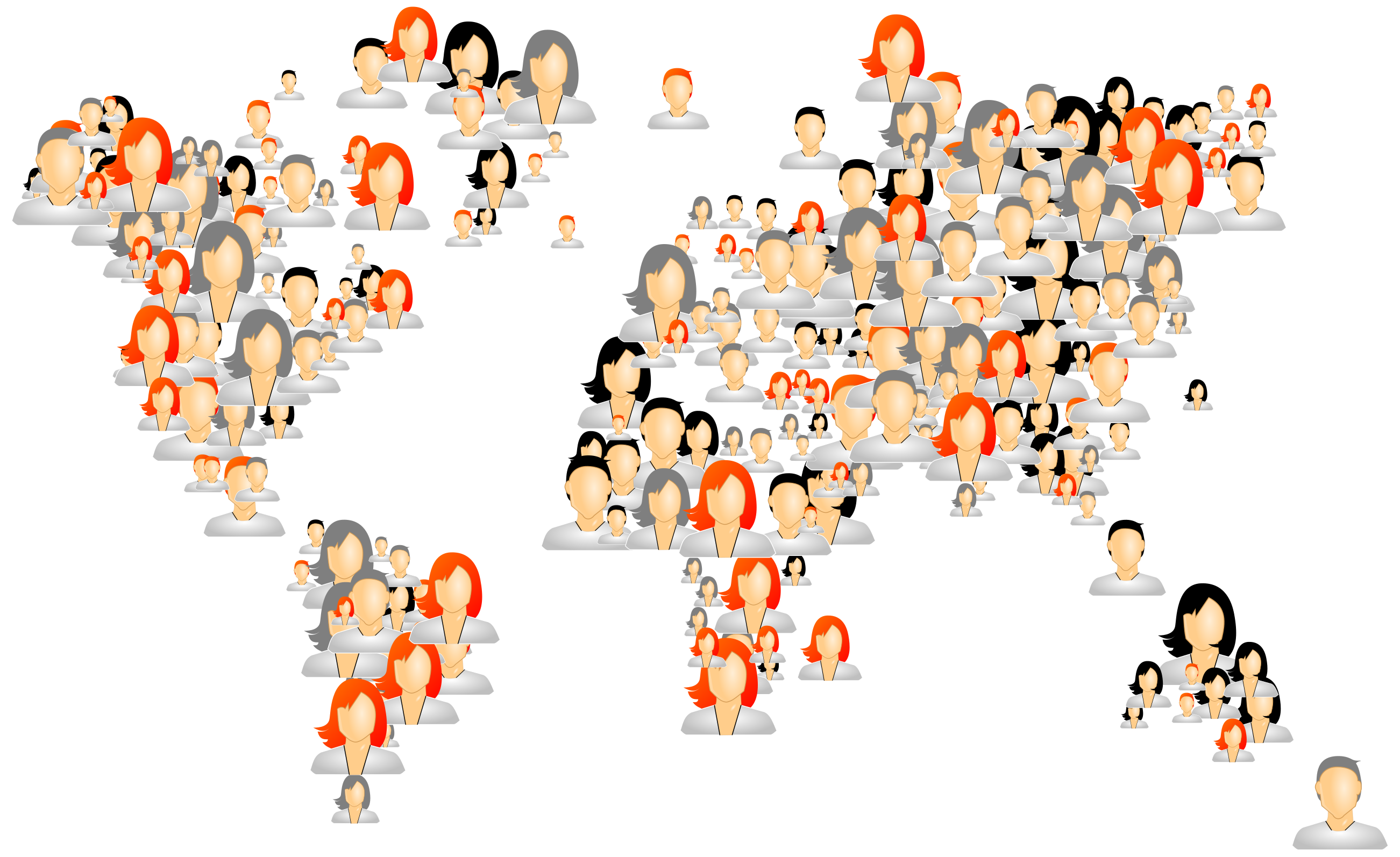 This features a large map of the world, with numerous people represented by small figures scattered across its surface. These figures are diverse in appearance and can be seen in various locations around the globe. Some of these figures are closer to the center of the map while others are more towards the edges or corners. Overall, it is an intriguing visual representation of a global community, with each individual figure representing a unique aspect of humanity.