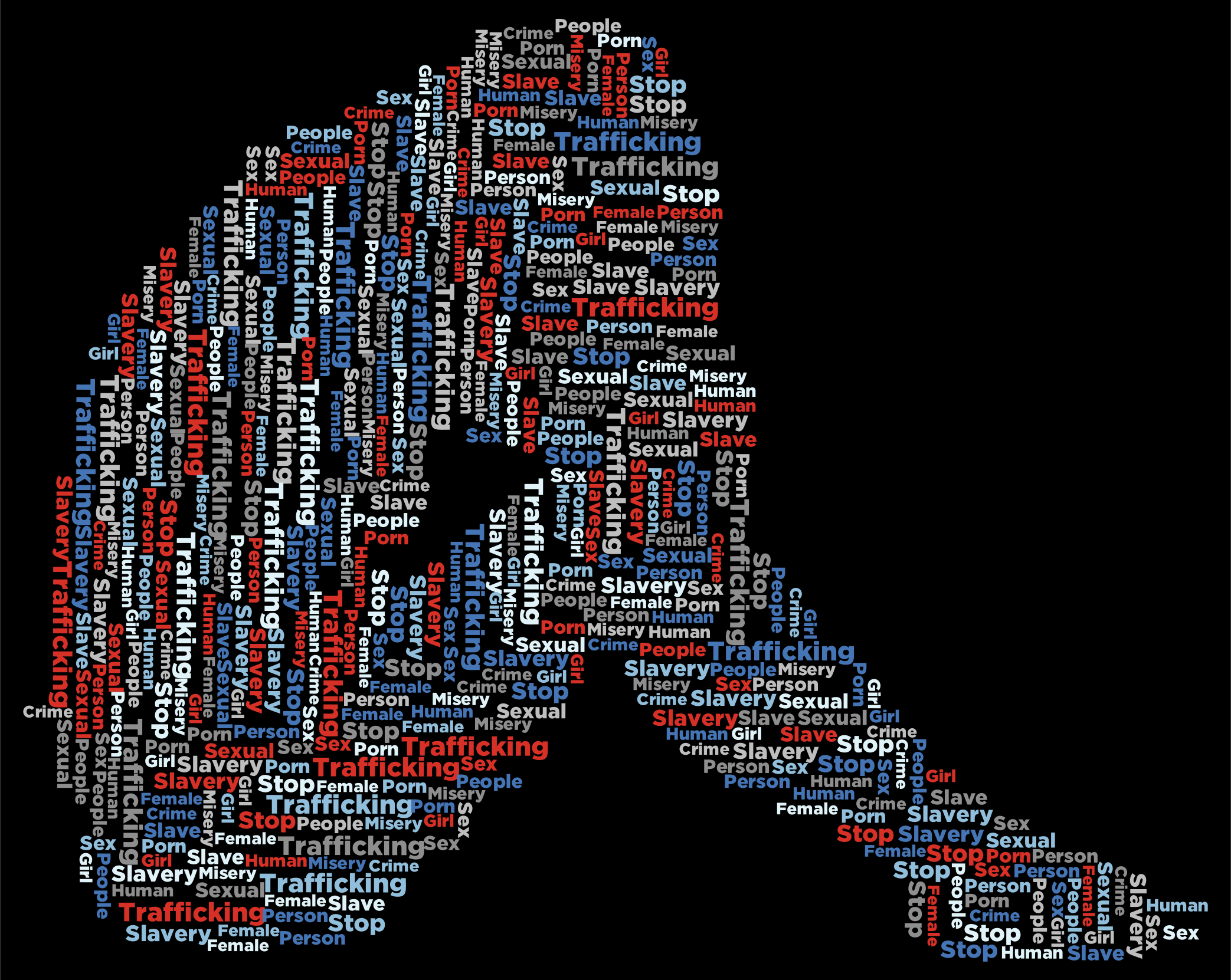 This is a black and white picture of a person's torso, with the word "trafficking" written in red. Surrounding this central word are various other words that relate to human trafficking, such as "people," "sex," "slavery," "prostitution," and "stop." The image is a powerful visual representation of the issue of human trafficking and serves as a reminder of the importance of putting an end to this form of modern-day slavery.