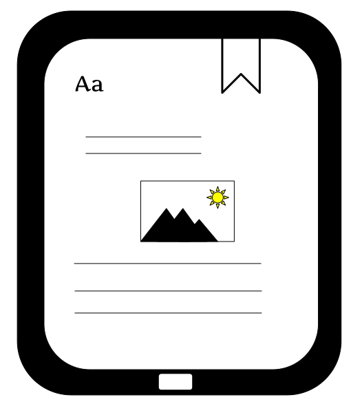This features a book with an electronic screen displaying a picture of the sun and mountains. The screen is divided into sections, including lines that form upper and lower case letters as well as a bookmark at the top right corner. The overall appearance suggests a modern and sophisticated reading experience.