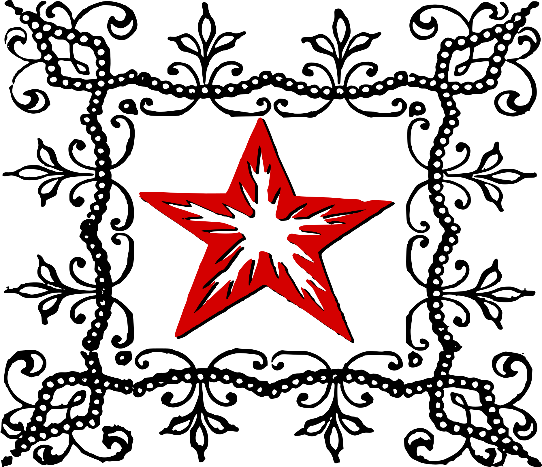 This features a red star with a white outline, surrounded by an ornate black and white design. The star is positioned in the center of the frame, drawing attention to its bold color contrast against the intricate background. The overall composition creates a visually appealing and eye-catching design that can be used for various purposes such as decoration or artistic expression.