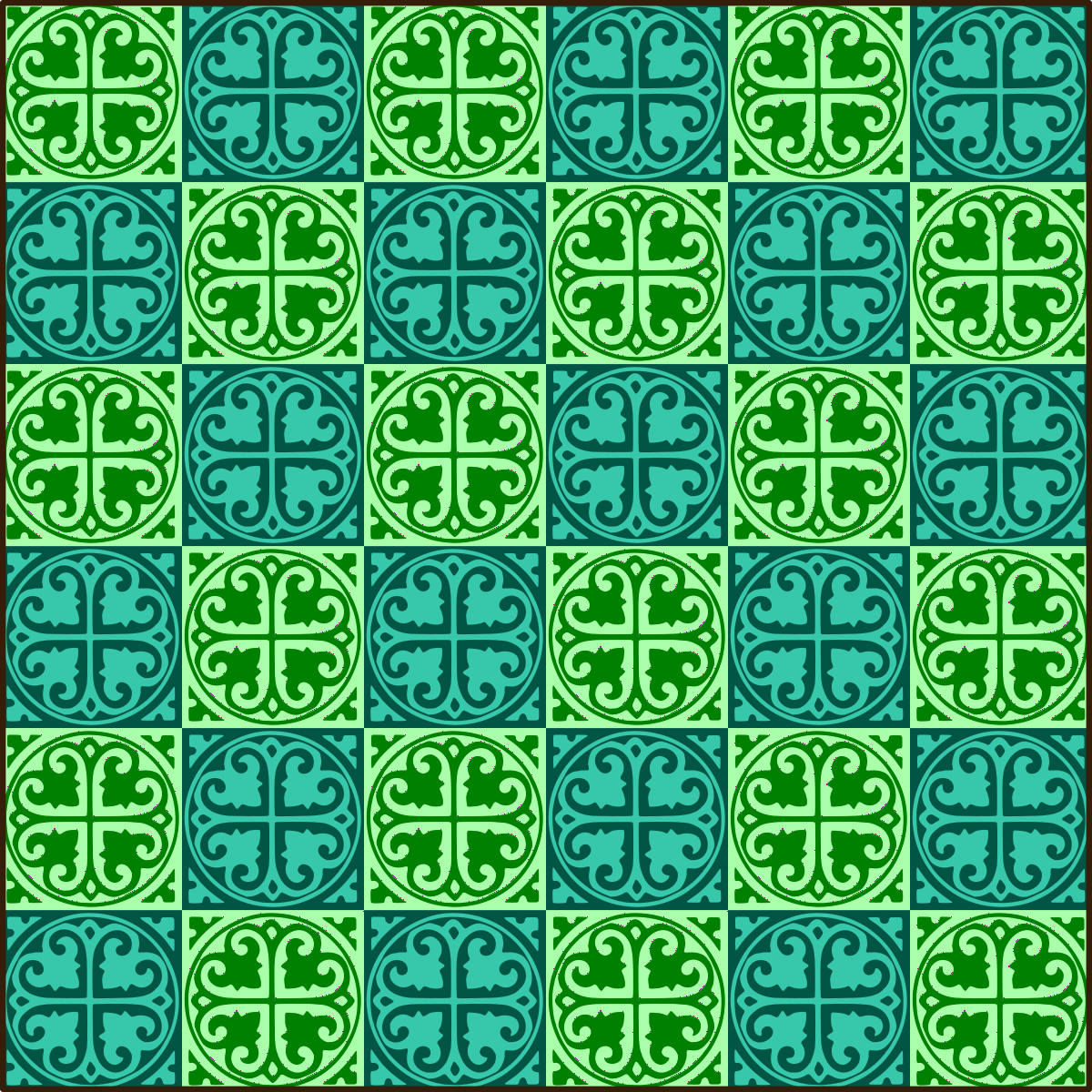 This features a blue and green tile pattern with a unique design. The tiles are made up of squares, each containing a clover-shaped design in the center. The squares vary in size and color, with some being lighter shades of green and others darker shades. This intricate pattern creates an eye-catching and visually appealing display that can be used for various purposes such as wallpaper or decorative elements.