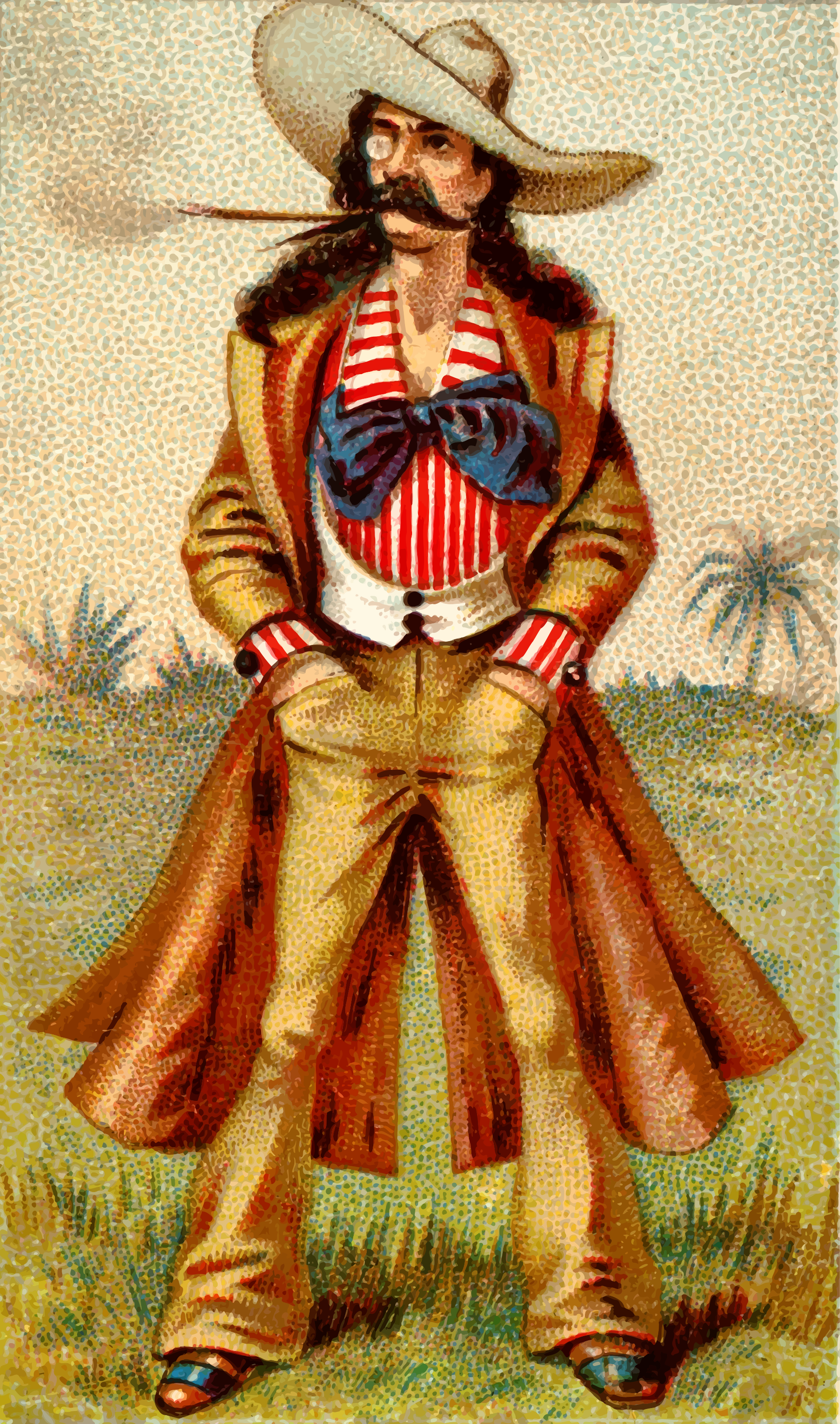 This features a man dressed in a cowboy outfit, complete with a hat and a mustache. He is standing on grass, possibly in the desert or a field, as he poses for the picture. The man appears to be wearing a tie that has red stripes, adding a touch of color to his attire. In addition to the main subject, there are several other people visible in the background, but they do not seem to be the focus of the image. Overall, it is an interesting and unique portrait of a man dressed as a cowboy.