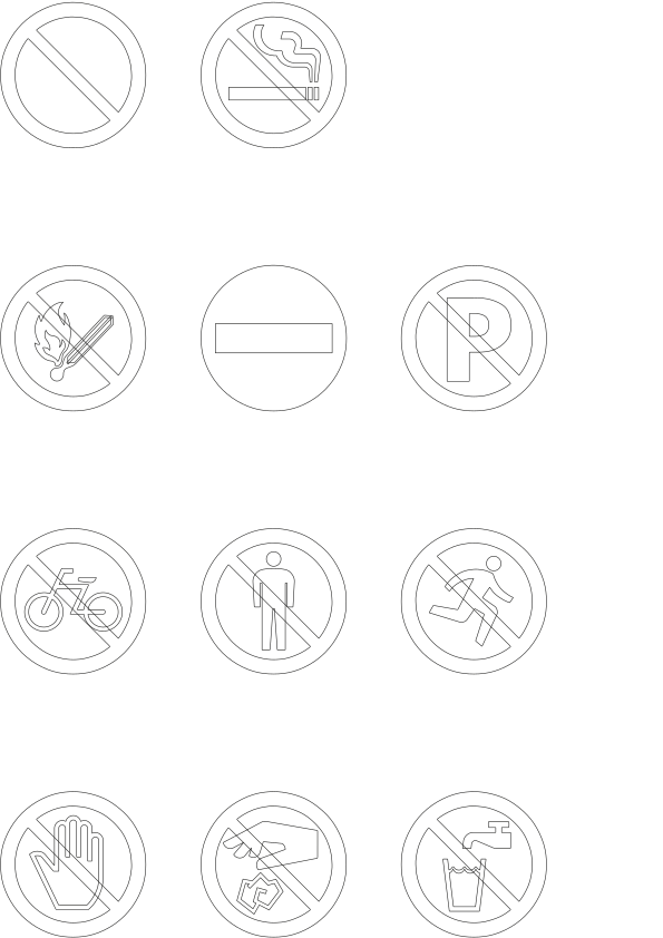 This features a collection of various symbols, including no smoking signs and other prohibited items. There are twelve different symbols in total, each with distinct meanings. Some of the symbols include a person, a bicycle, a car, a handbag, a cell phone, a cup, a bottle, a knife, a book, a bed, and a chair. The symbols are arranged in a row, making it easy to identify their meanings at a glance. This collection of symbols could be used for various purposes such as warning people about certain rules or regulations in public spaces or providing guidance on what is allowed or not allowed in specific areas.