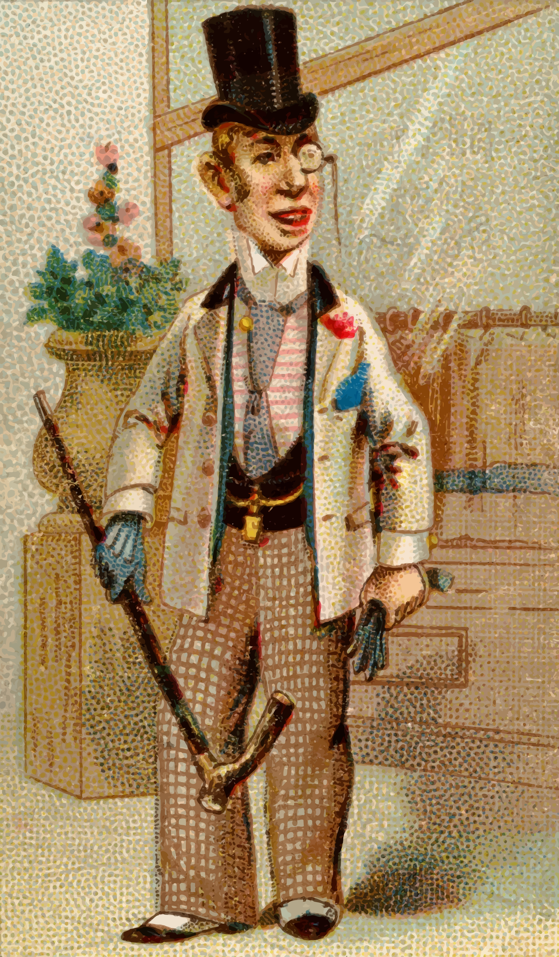 This features a man dressed in a suit and tie, wearing a top hat. He is holding a cane in his hand while standing next to a cabinet or dresser. There are several potted plants placed around the room, with one near the left side of the scene, another on the right side, and two more located closer to the center. The man appears to be the main focus of the image, as he is positioned in the foreground while the other elements in the background create a sense of depth and space.