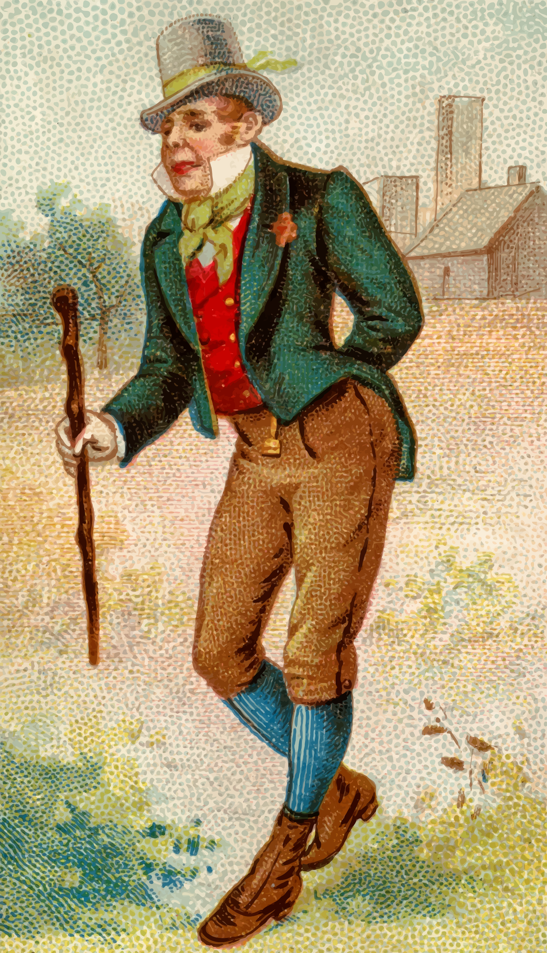 This features a man dressed in a suit and hat, walking across a field. He is holding a cane in his hand as he strolls through the grassy area. The scene appears to be an illustration or drawing of a man with a top hat, possibly from a book or other printed material. The man's attire suggests that he may be dressed for a formal event or simply enjoying a leisurely walk outdoors.