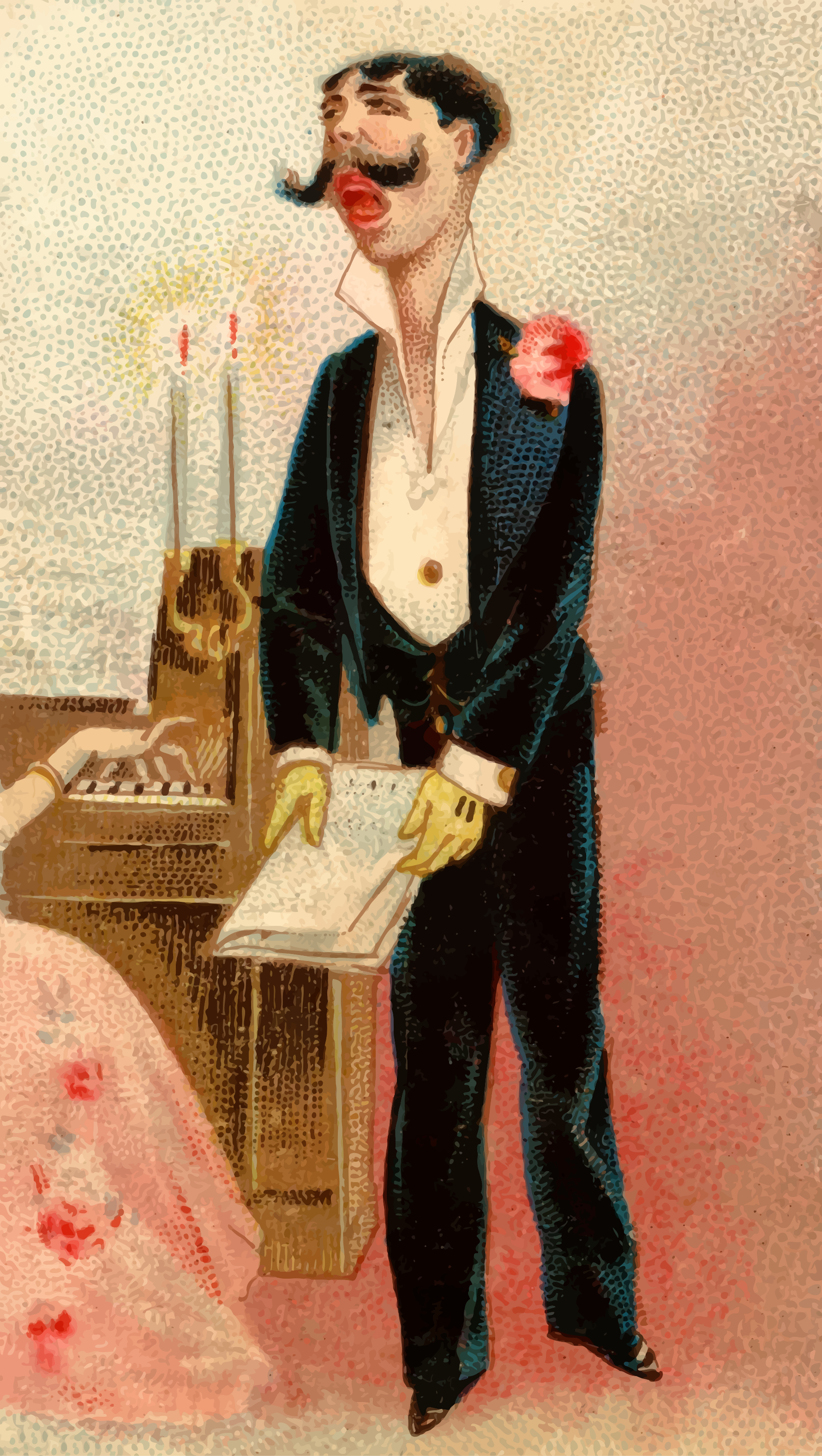 This features a man and woman standing next to each other, both dressed in formal attire. The man is wearing a suit with a tie, while the woman appears to be in a dress. They are positioned near a piano, which takes up a significant portion of the scene. In addition to their clothing, they also have accessories such as a handbag and a book. The man has a distinctive appearance, as he is wearing a mustache and holding a cigar in his mouth. The woman appears to be looking at him, possibly engaging in conversation or observing the scene around them. Overall, the image captures a moment of social interaction between the two individuals in an elegant setting.