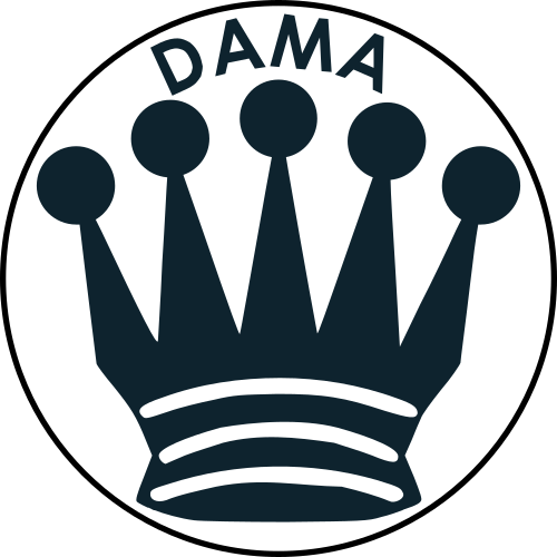 This features a black and white circular logo with the word "DAMA" written in the center. Surrounding the central text are five white circles, each containing a small crown. These crowns are arranged around the outer edge of the circle, creating an elegant and visually appealing design. The combination of the word "DAMA" and the intricate crown pattern gives the logo a sophisticated and regal appearance.