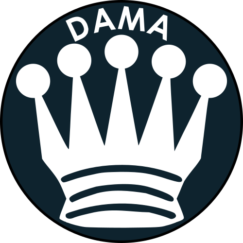 This features a black and white circular logo with a crown on top. The crown is surrounded by five smaller crowns, creating an intricate design. The central crown has the word "DAMA" written in it, indicating that this could be related to a brand or organization. The overall appearance of the logo suggests a sense of royalty or authority.