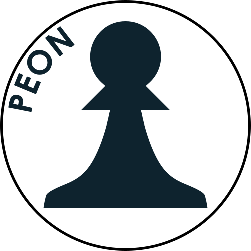 This features a black and white circle with the word "PEON" written in white. Inside this circle, there is an illustration of a large black triangle or pyramid shape. This design gives off a sense of strength and power, possibly representing a symbol or logo for a company or organization. The contrasting colors and the bold triangle shape make it an eye-catching and memorable image.