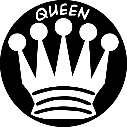 This features a black and white circular design with the word "Queen" written in white. The design is adorned with five white crowns, each placed at different positions around the circle. These crowns are spread out evenly across the entirety of the circle, creating an elegant and regal appearance. The combination of the word "Queen" and the intricate crown pattern makes this a visually striking and memorable design.