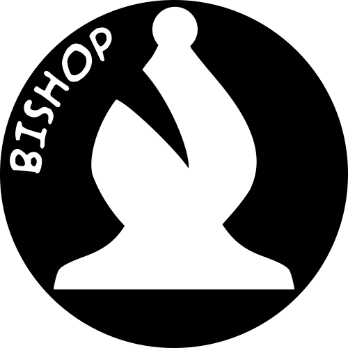 This features a black and white circular logo with the word "Bishop" written in white. In the center of the logo, there is an illustration of a chess piece, which appears to be a knight. This design gives the impression that it could be related to a chess-themed brand or product. The overall appearance of the logo suggests a sense of authority and sophistication, with the white text contrasting against the black background.