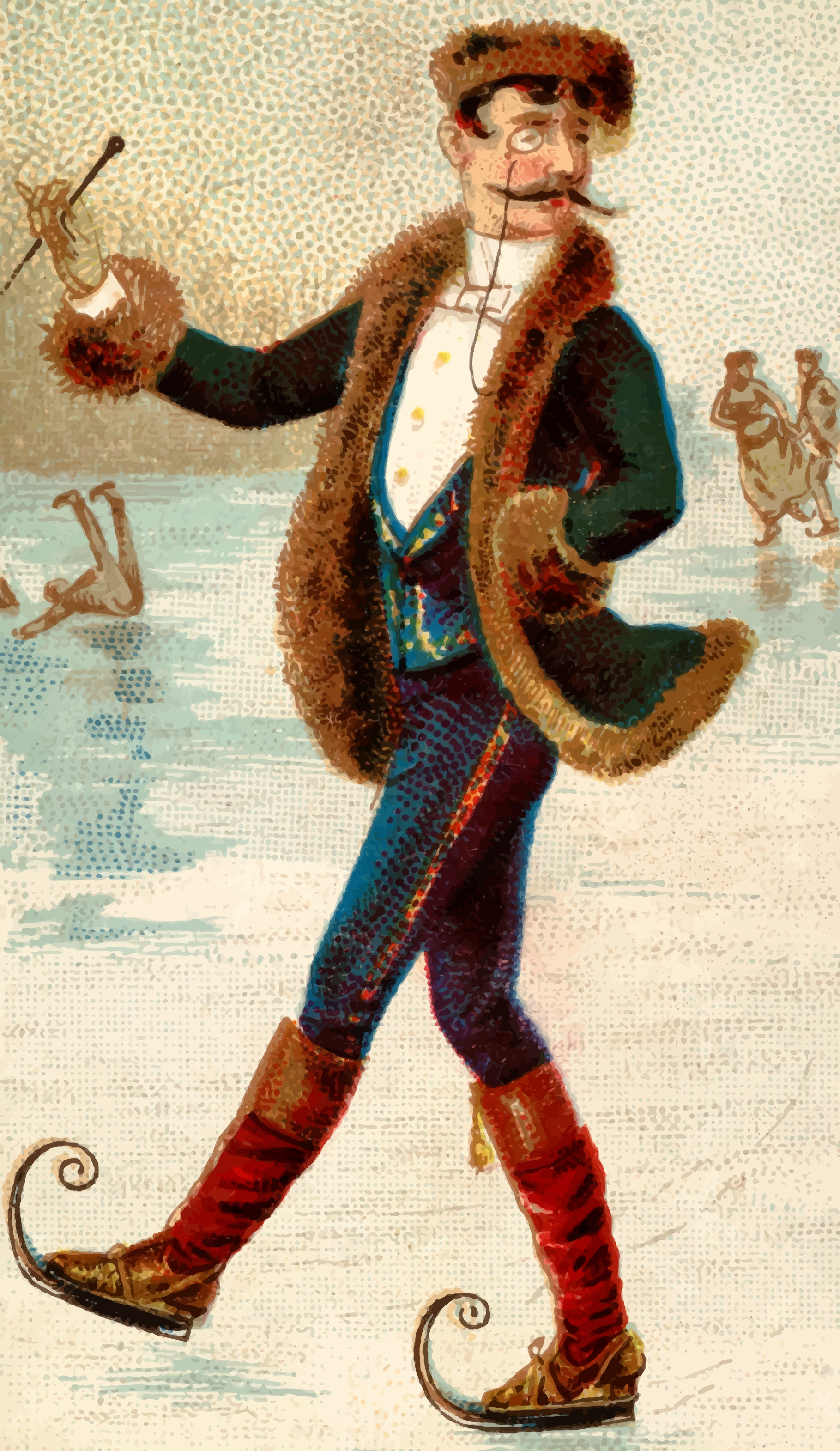 This features a man dressed in a suit and tie, wearing a fur coat with a large collar. He is holding a pair of skis while standing on the ice. In addition to the main figure, there are several other people visible in the background, some closer to the foreground and others further away. The scene appears to be set outdoors during wintertime, possibly at a ski resort or similar location.
