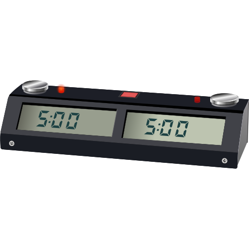 This features a digital clock with two screens displaying the time. It is black in color and has buttons on top, which are likely used to control the settings or functions of the clock. The clock displays the time as 5:00, indicating that it's currently five o'clock. This device could be useful for chess players who need to keep track of their game time or for anyone looking to manage their schedule efficiently.