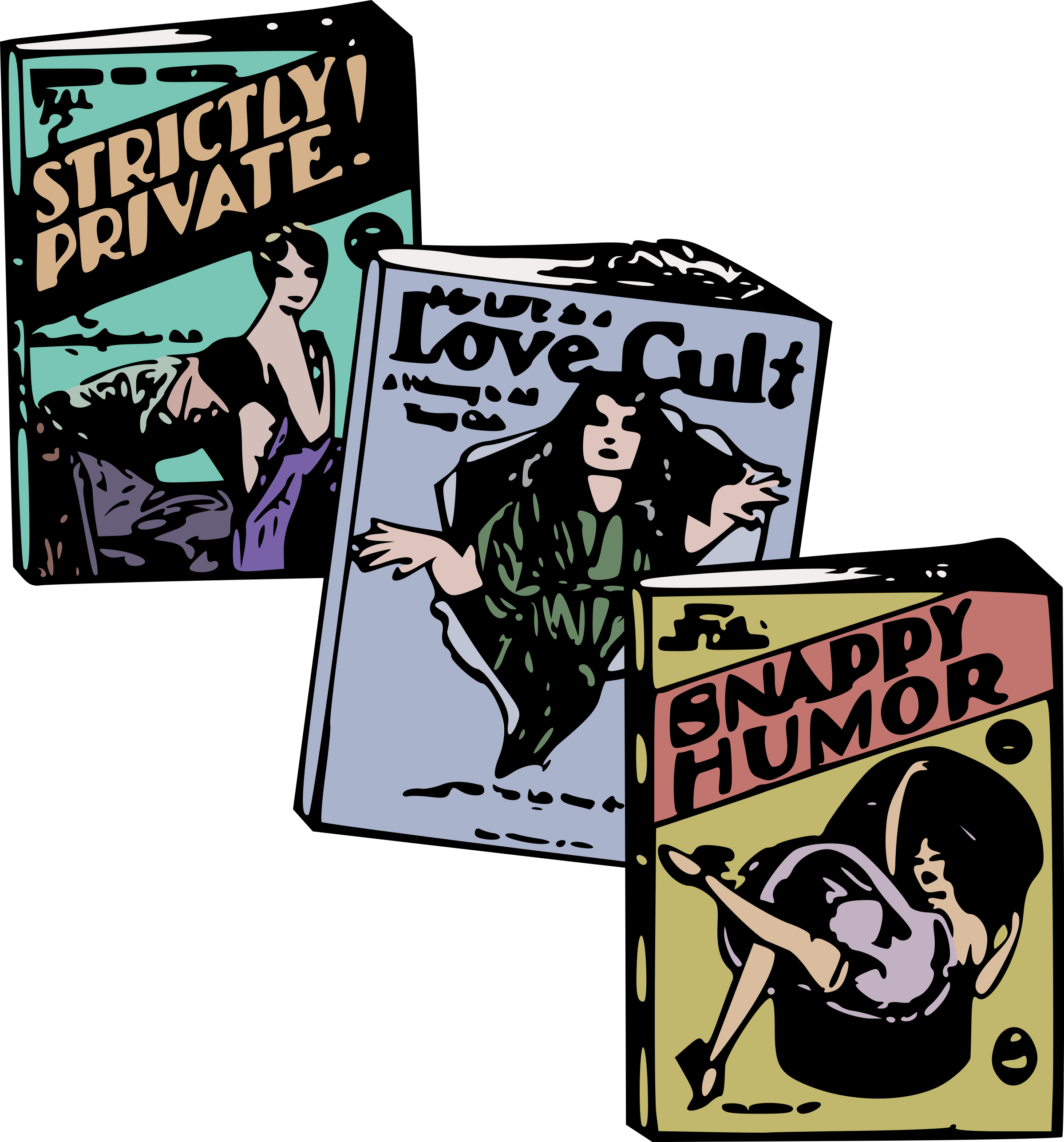 This features three books with colorful covers, each depicting a woman in various poses. One book is titled "Strikingly Private," another is called "Love Cult," and the third one is named "Snappy Humor." These books are displayed on a table or shelf, showcasing their vibrant colors and eye-catching designs. The covers of these books seem to be from an older time period, possibly from the 1950s or earlier, as they feature women in retro poses that reflect the fashion and culture of that era.