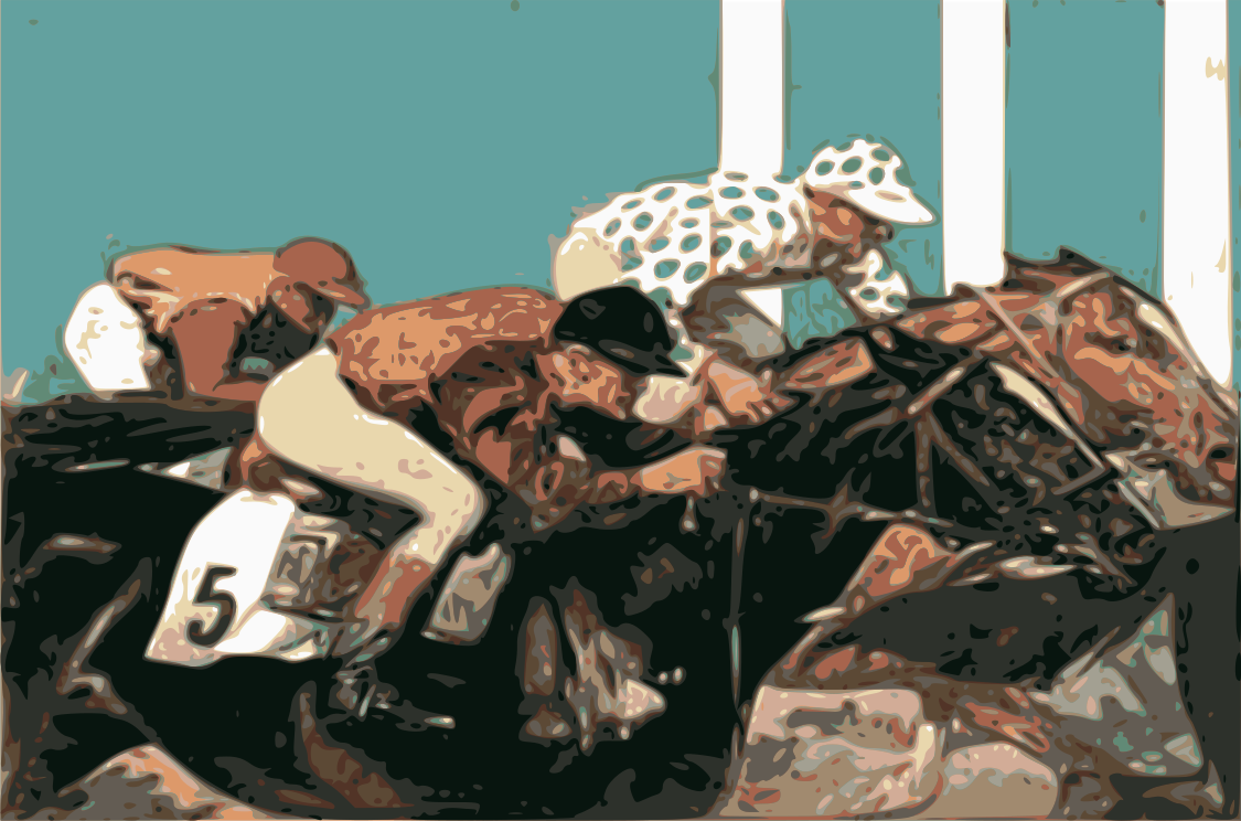 This features a group of jockeys riding horses, with one horse in the center of attention. This particular horse is being tended to by two men who are trying to fix its harness. There are several other people present in the scene, some of whom appear to be jockeys as well. The image captures a moment where the jockeys and their horses are gathered around the fallen horse. The men working on the harness seem focused and determined to get the horse back up and running smoothly. This scene likely represents an intense competition or race, with everyone involved trying their best to ensure the success of their respective teams.