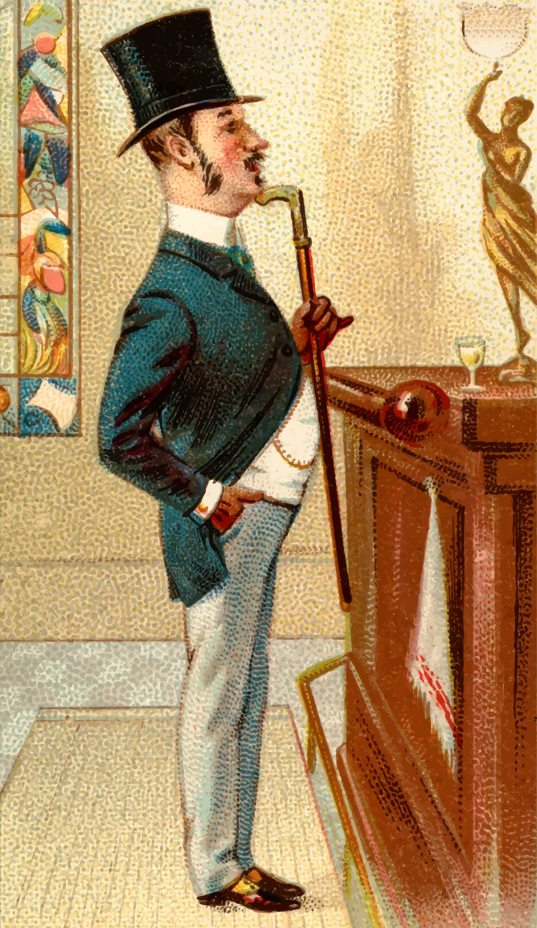 This features a man dressed in a suit and tie, wearing a top hat and holding a cane. He appears to be an older gentleman with a mustache and goatee. The man is standing next to a bar or counter, possibly posing for a portrait. In the background, there are two wine glasses placed on the surface of the bar. Additionally, there is a statue of a woman visible in the scene, adding an artistic touch to the overall composition.