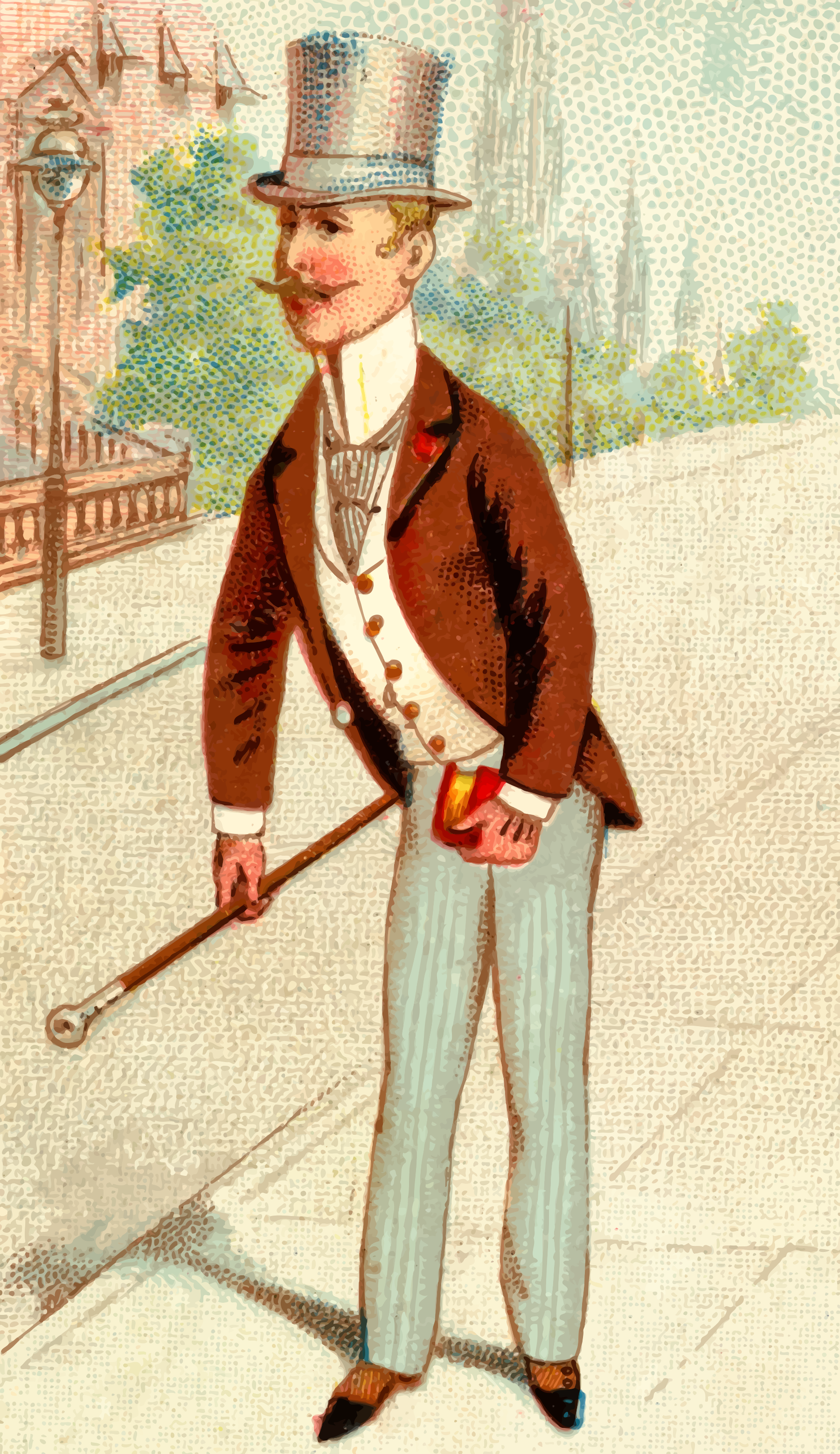 This features a man dressed in a top hat and suit, standing on the sidewalk. He is holding a cane in his hand while looking down at something on the ground. The scene appears to be an illustration or drawing of a man in formal attire. In addition to the main subject, there are two other people visible in the background, one closer to the left edge and another further back on the right side.