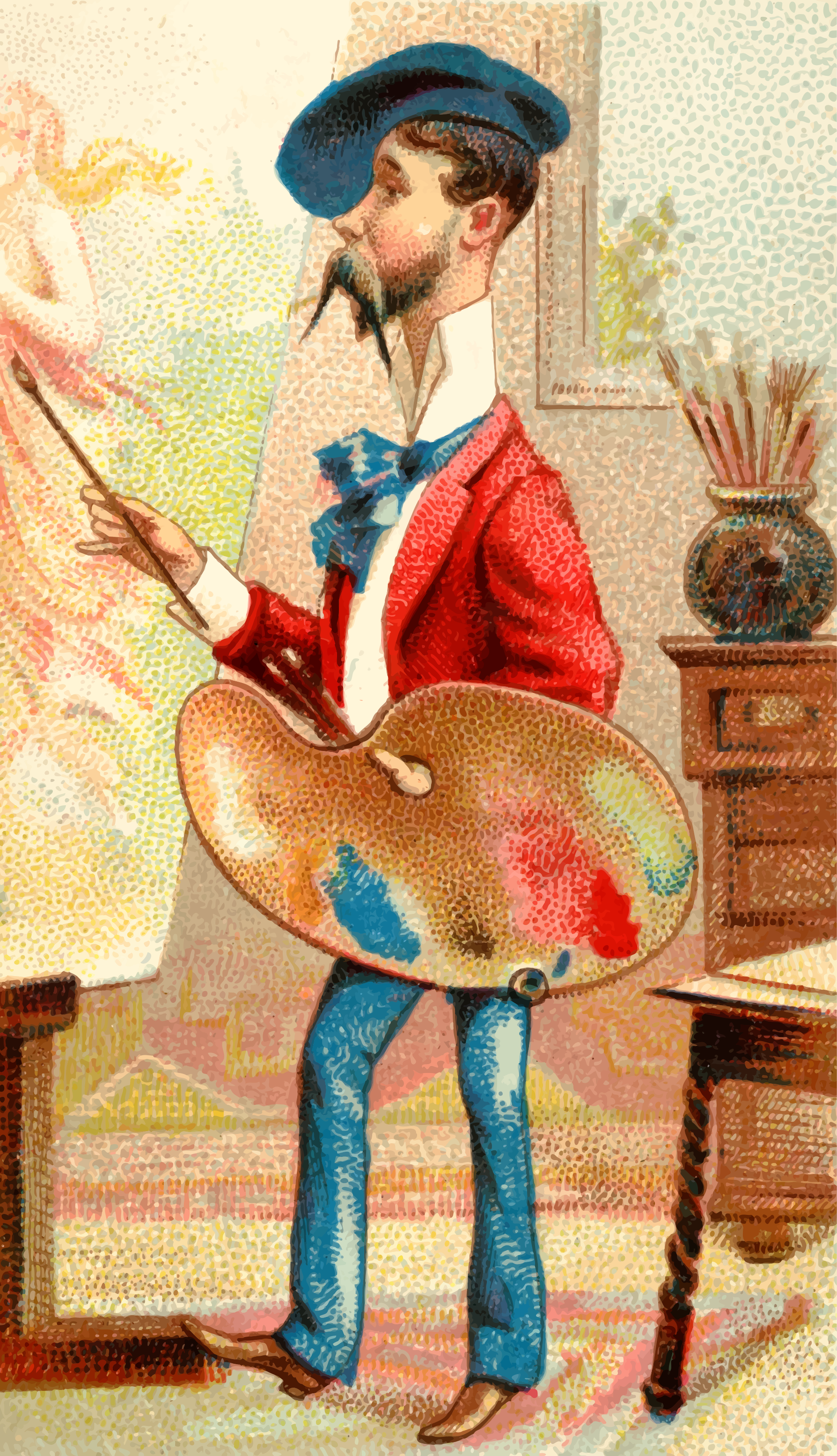This features a man dressed in a red jacket and bow tie, holding a painting brush. He appears to be an artist or a performer, possibly from the World's Dudes series of cigarette cards from Allen & Ginter. The man is standing next to a table with various items on it, including a vase and a cup. There are also two bottles in the scene, one located near the top right corner and another towards the bottom left side. Additionally, there is a chair situated close to the center of the image.