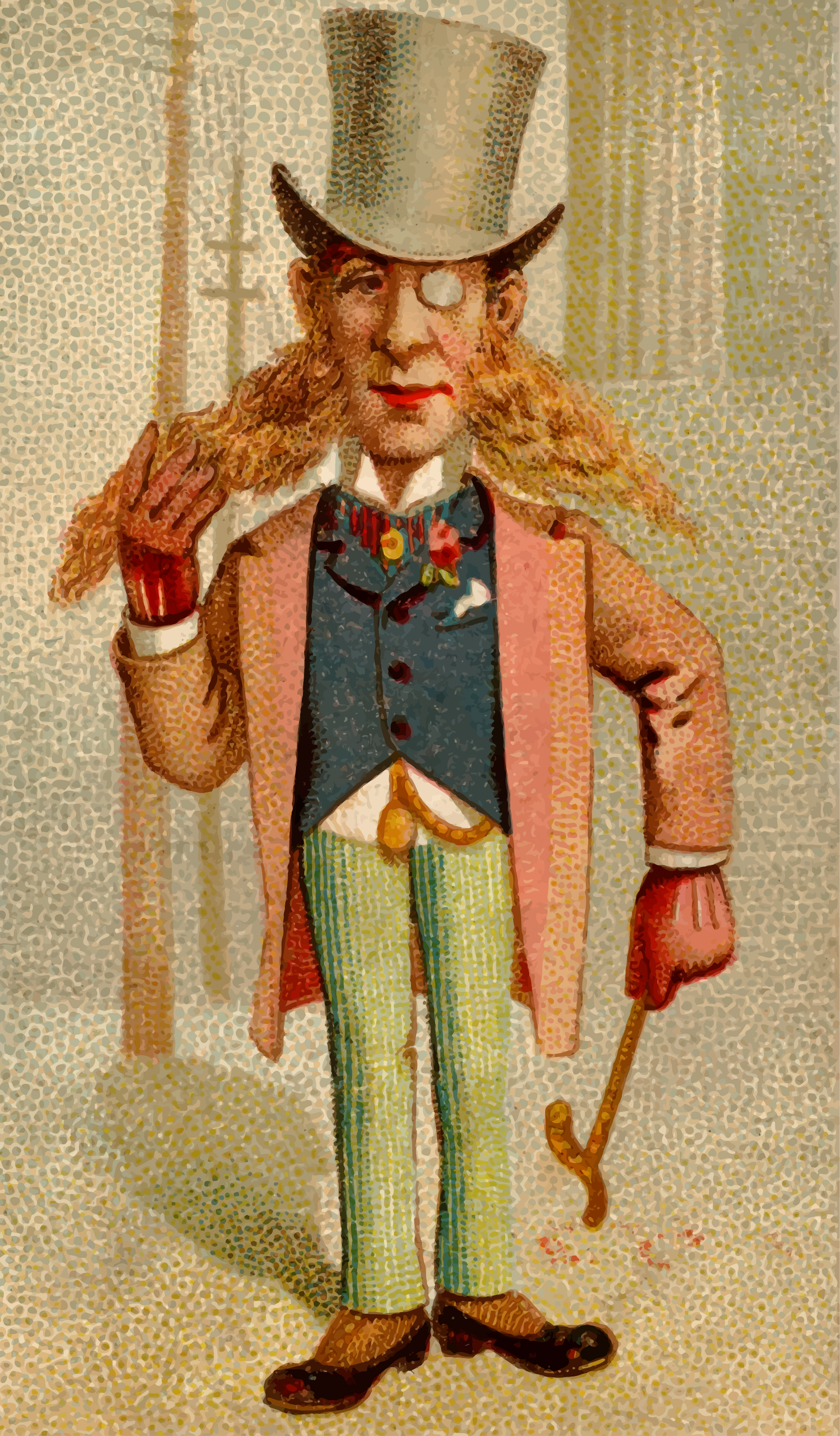 This features a man dressed in a top hat and coat, holding a cane. He is wearing a tie and has a mustache, giving him an old-fashioned appearance. The man appears to be standing on the street, possibly posing for a picture. The scene is depicted with a vintage style, which adds to the overall charm of the image.