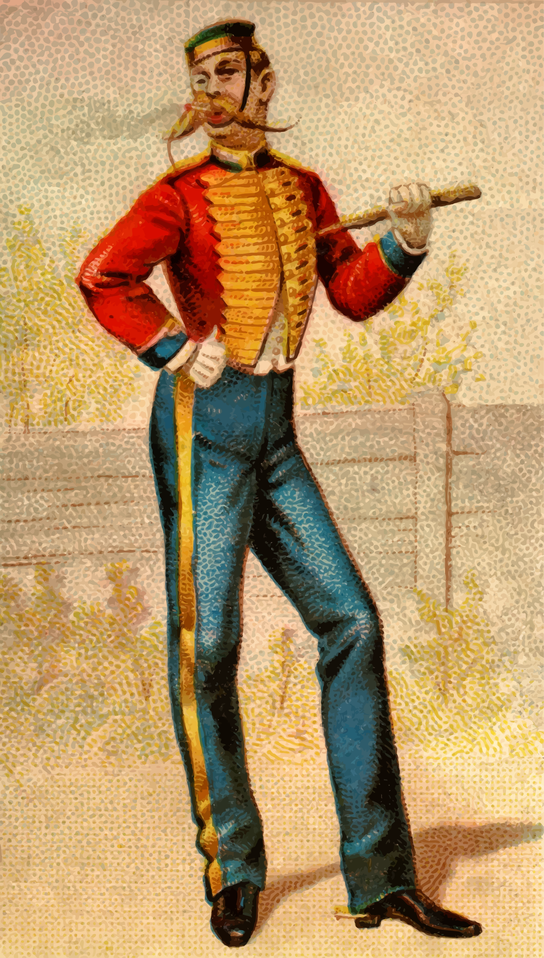 This features a man dressed in military garb, standing with his hands on his hips and holding a pipe. He is wearing a red jacket and blue pants, giving him an air of confidence and authority. The man's attire suggests that he might be a soldier or a member of the royal guard. The image has been edited to enhance its visual appeal, with contrast adjustments made to improve the overall quality of the picture. This artistic touch adds depth and interest to the scene, making it an attractive piece of artwork.