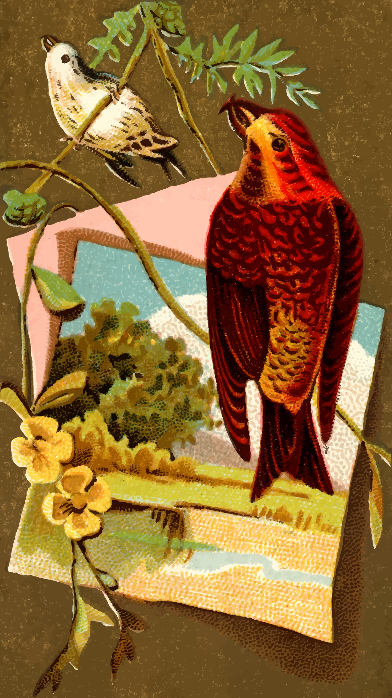 This features a beautifully illustrated bird with red and black feathers perched on top of a branch. It appears to be an old picture, possibly from the 1950s or earlier, as it has a vintage feel to it. In addition to the main bird, there are two smaller birds in the scene, one located near the left edge and another towards the right side. The image also includes a potted plant situated at the bottom of the picture, adding an element of nature to the composition.