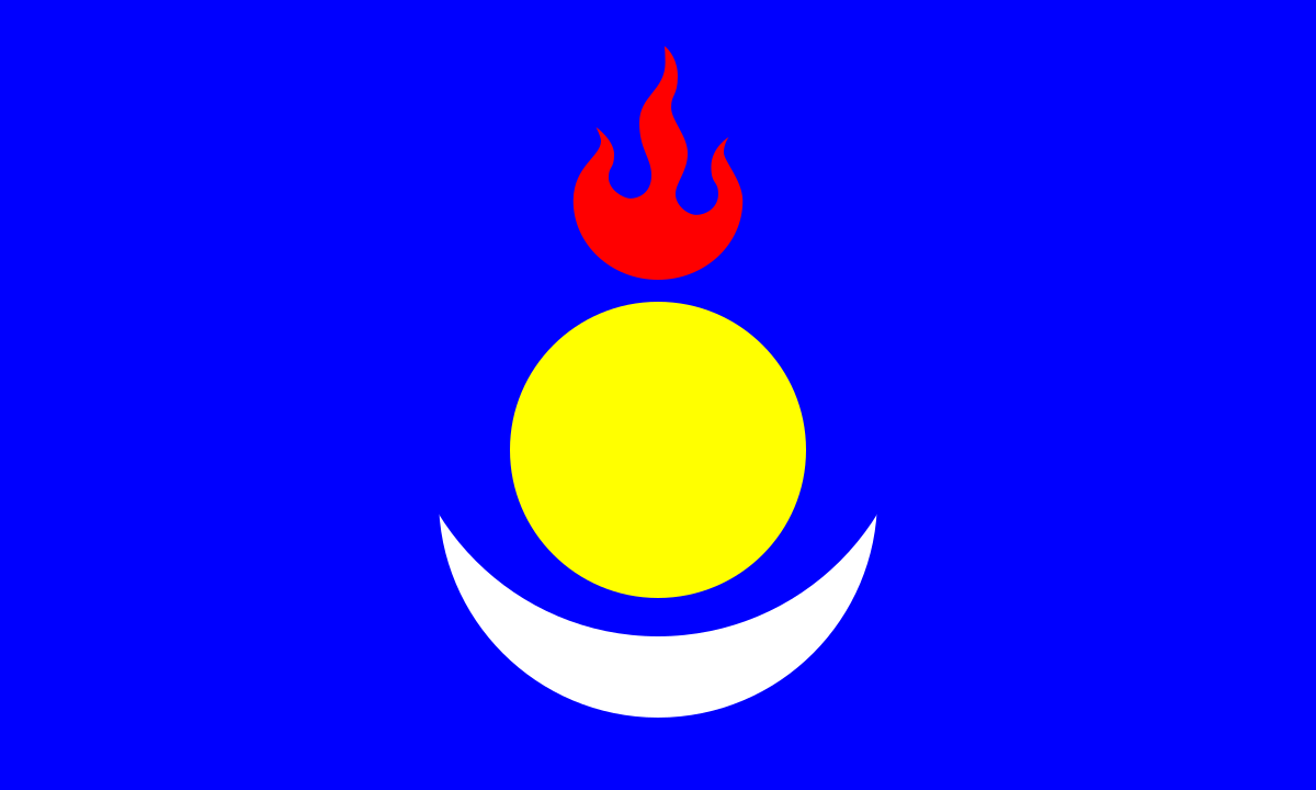 This features a blue flag with a yellow sun in the center. The sun is surrounded by a circle, and there are flames coming out of it, giving the impression that it's on fire. This unique design makes for an eye-catching flag.