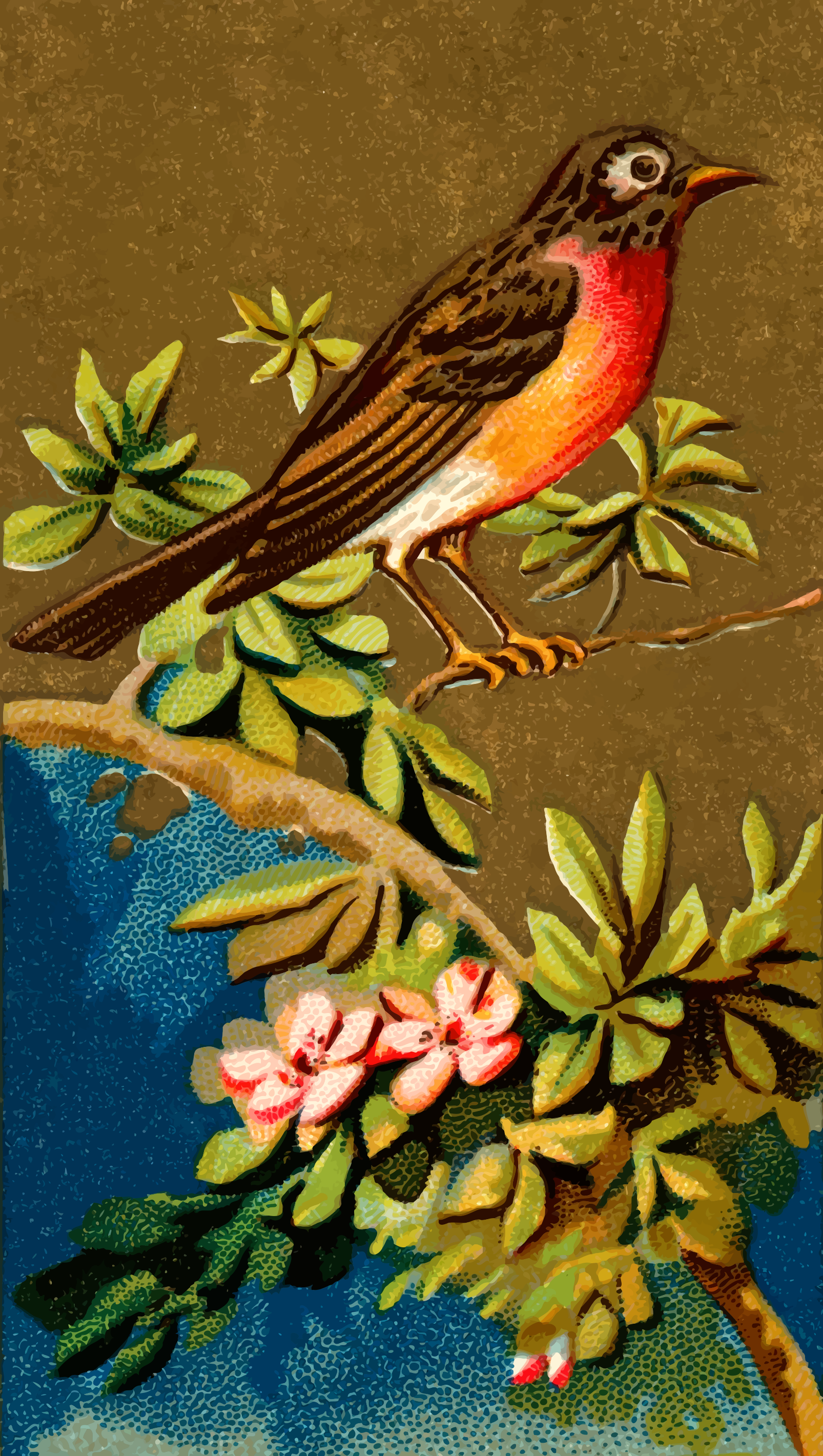 This features a beautifully illustrated bird perched on a branch. The bird is the main focus of the scene, and it appears to be looking upwards with its head tilted slightly. The branch has leaves surrounding it, adding to the natural setting of the image. The bird's position on the branch suggests that it might be resting or observing its surroundings. Overall, this artistic depiction captures a serene moment in nature.