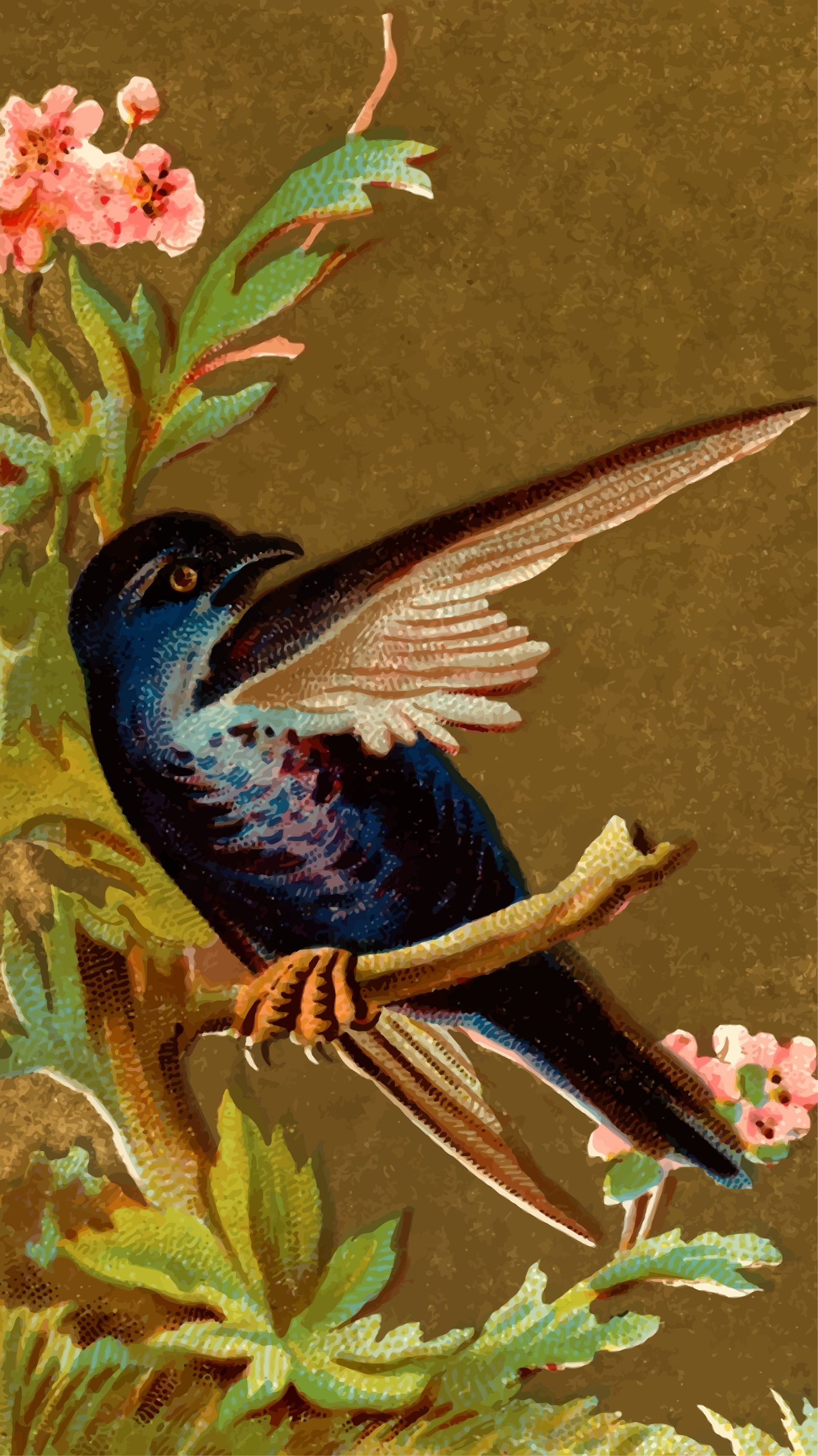 This features a beautifully illustrated bird perched on a branch, surrounded by pink flowers. The bird is the main focus of the scene and appears to be in mid-flight as it sits on the branch. The background consists of a brown wall with a few more branches visible, adding depth to the composition. The overall atmosphere of the image is serene and captivating, showcasing the delicate beauty of nature.
