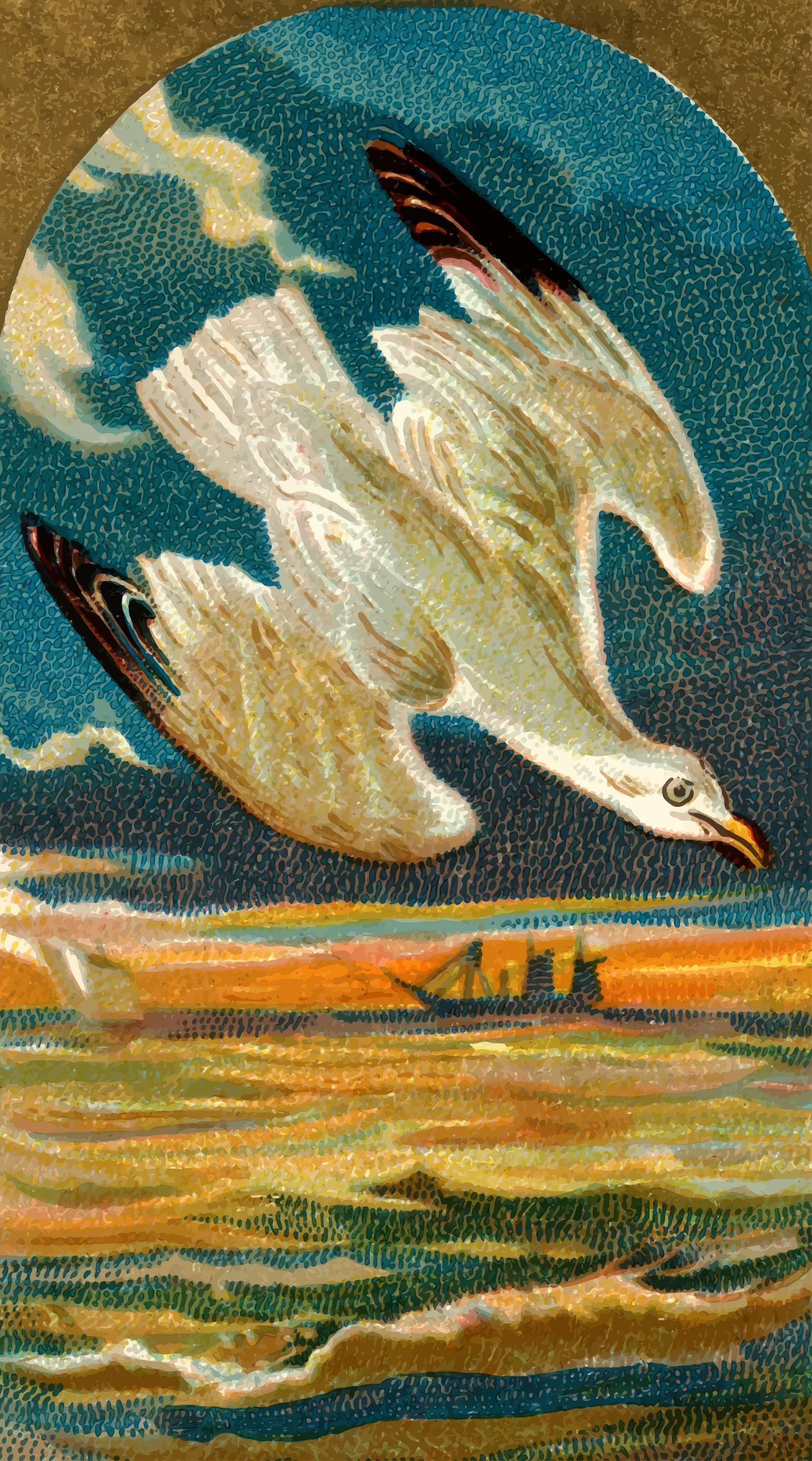 This features a beautifully painted seagull flying over the ocean, with its wings spread wide. The bird is captured in mid-flight, soaring above the water's surface. In the background, there are two ships visible on the horizon, adding to the serene and picturesque scene. The artwork showcases a sense of freedom and grace as the seagull glides effortlessly through the sky.