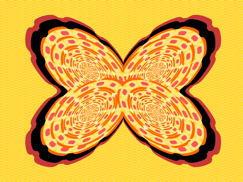 This features a yellow background with an intricate design of two overlapping butterfly shapes. These butterflies are made up of various colors, including red and orange, which create a vibrant and eye-catching pattern. The butterflies are positioned in such a way that they appear to be intertwined or connected, giving the impression of a single, larger butterfly shape. This unique design creates an interesting visual effect that captures attention and adds a touch of creativity to the background.