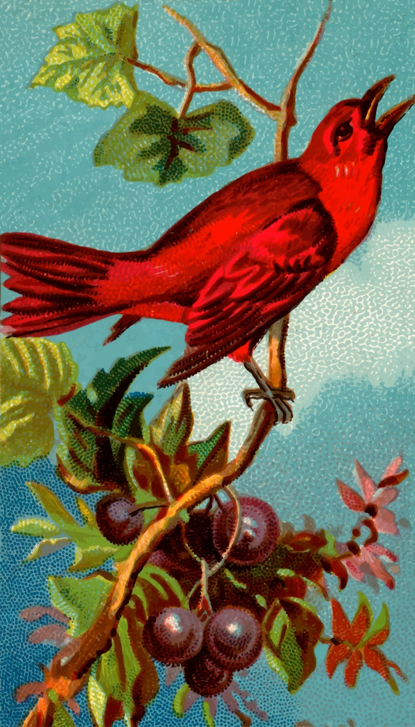 This features a red bird perched on a branch with green leaves. The bird is the main focus of the scene, and it appears to be singing as it sits on the branch. The background consists of a sky, which adds depth and contrast to the overall composition. This artistic representation of a bird in its natural habitat showcases the beauty and harmony between nature and wildlife.