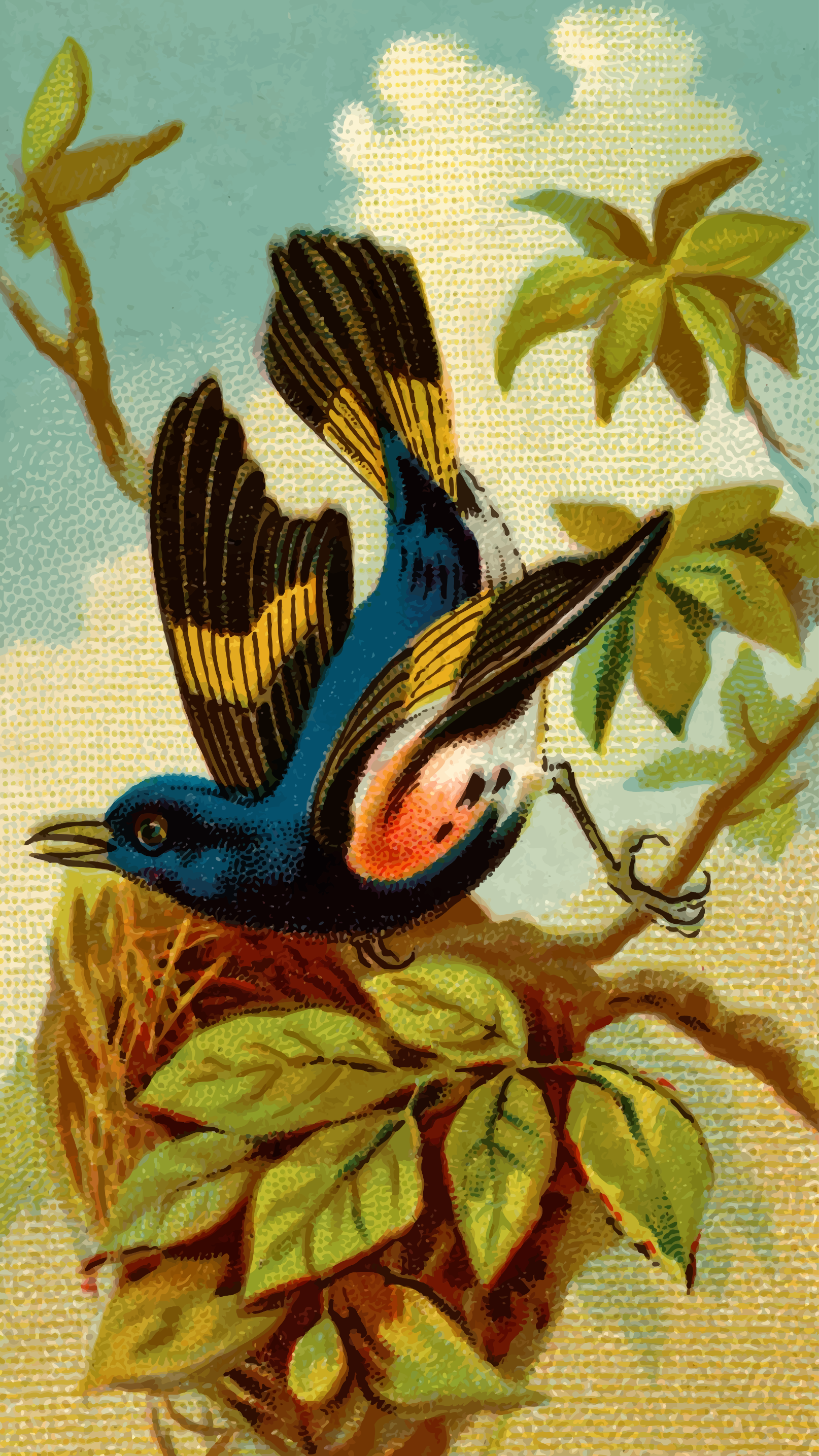 This features a beautifully colored blue and yellow bird perched on a branch. The bird is surrounded by green leaves, which provide a natural backdrop for the scene. The vibrant colors of the bird and its surroundings create an eye-catching visual display. This artistic representation of nature showcases the beauty found in the avian world.
