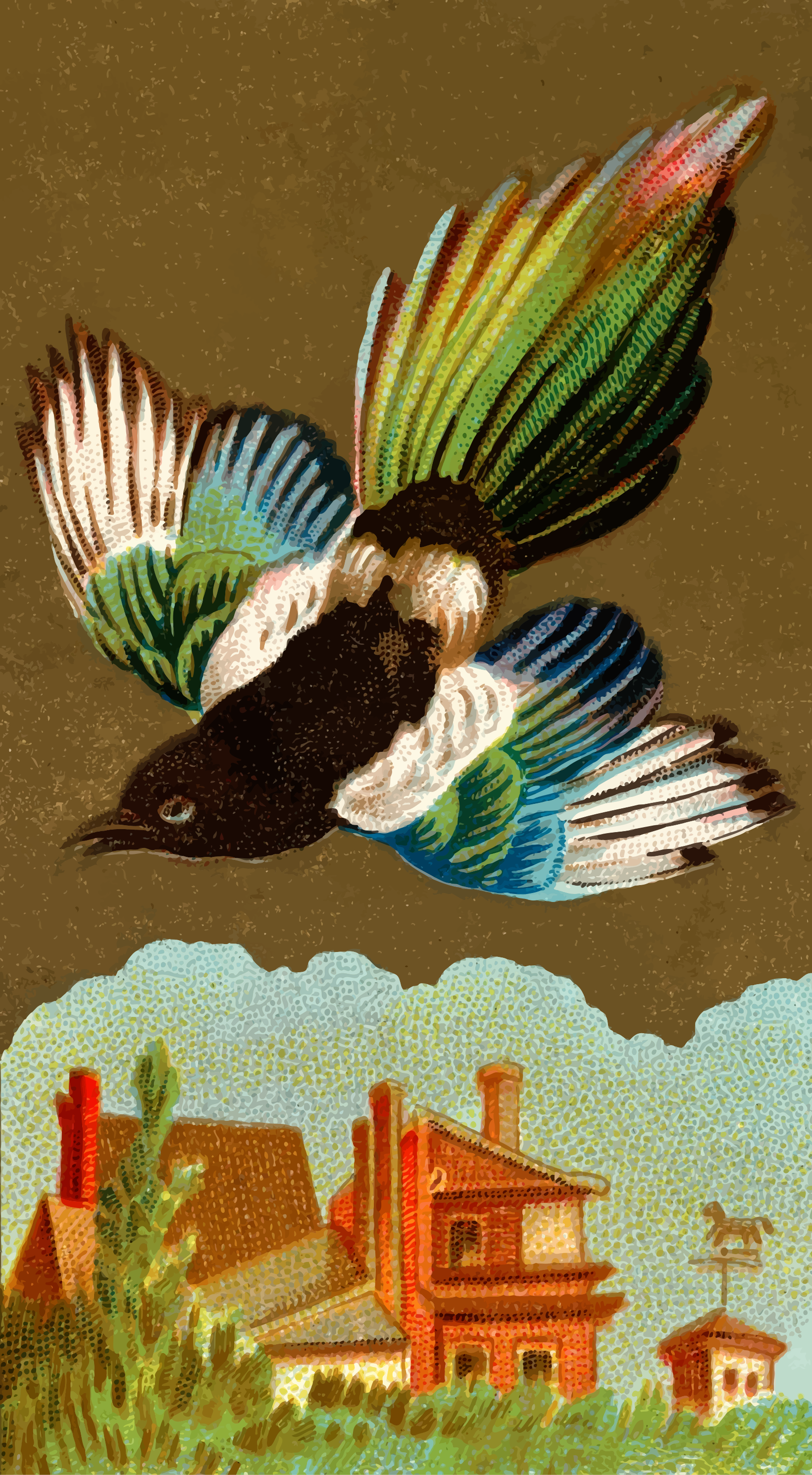 This features a colorful bird with green, blue, and white feathers flying in the air. It appears to be a painting or drawing of a parrot-like creature, possibly from an old cigarette card series called "Birds of America." The bird is captured mid-flight, soaring above a house and some trees. The scene has a vintage feel with its artistic style and the presence of the house and trees below the bird.