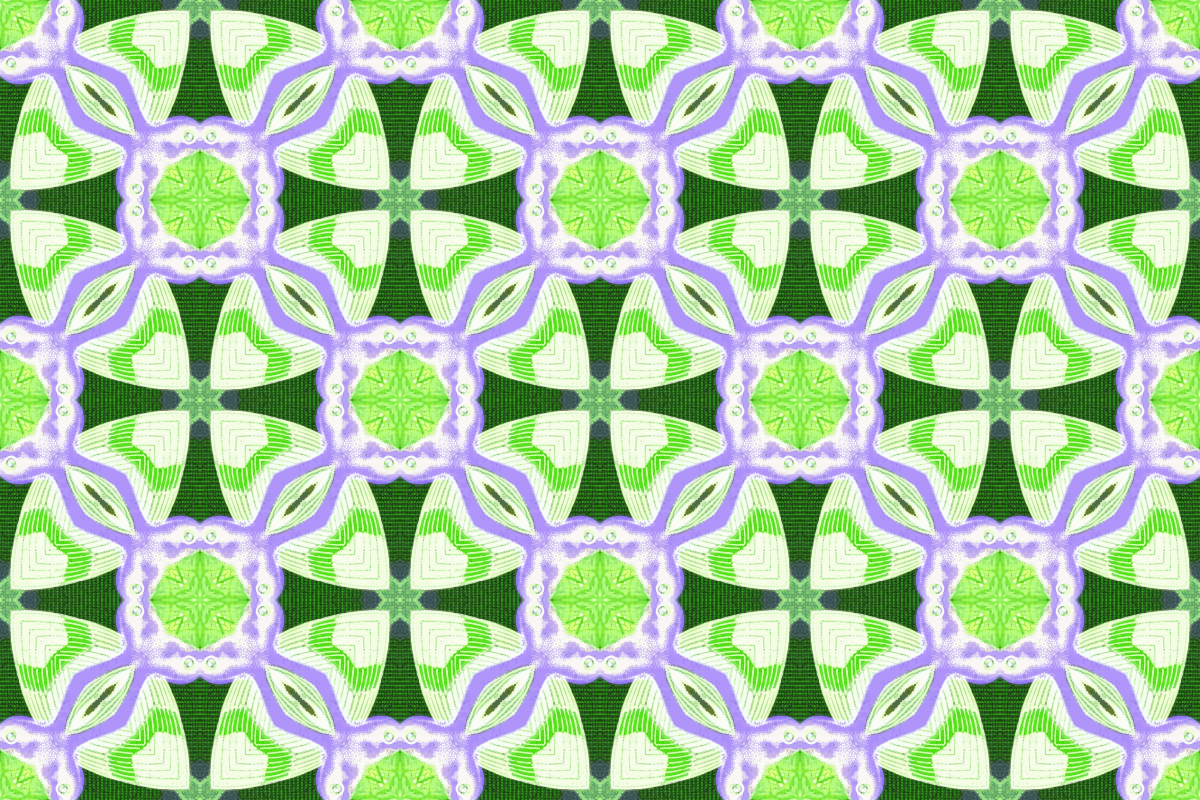 This features a pattern made up of various shapes, including circles and squares. These shapes are arranged in a way that creates an intricate design. The colors used for this pattern include green, purple, yellow, and white. The combination of these colors gives the pattern a vibrant and lively appearance. This design could be used as a wallpaper or applied to various surfaces to add visual interest and color.