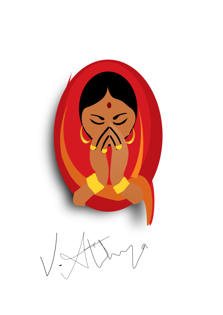 This features a woman wearing a red sari, with her hands clasped together in prayer. She has golden bracelets and hoop earrings on, adding to the elegance of her appearance. The woman's facial expression is one of deep concentration as she prays, possibly seeking guidance or peace within herself. The overall atmosphere of the image conveys a sense of spirituality and devotion.