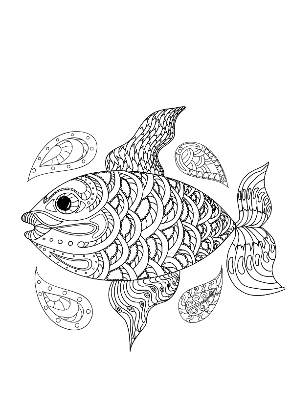 This features a black and white fish drawing with intricate patterns on it. The fish has two fins, one located towards the top left of the drawing and another at the bottom right corner. The fish's body is adorned with various decorative elements, making it an eye-catching piece of artwork. The overall design showcases a unique blend of nature and artistic expression.