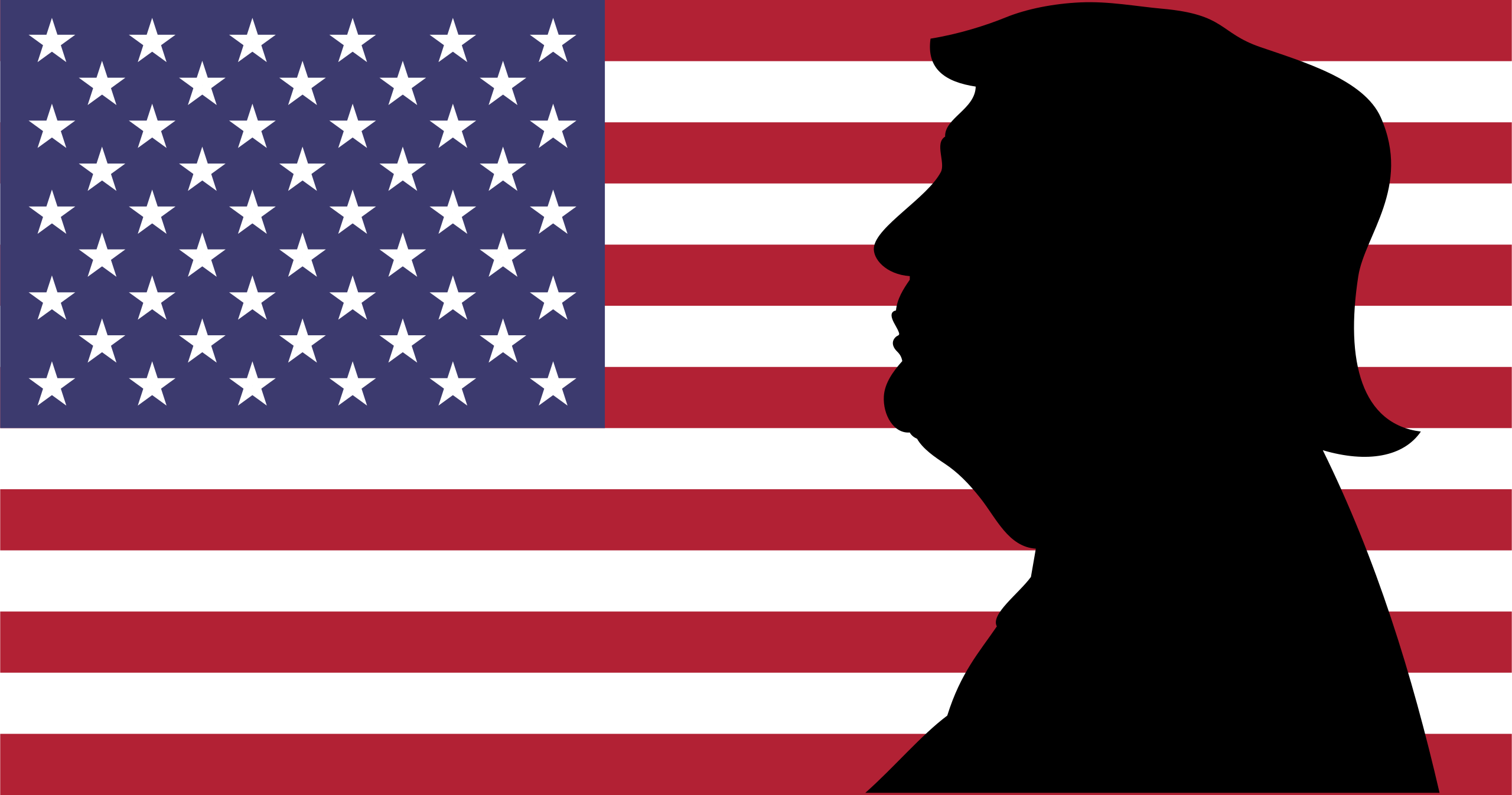 This features a large American flag with the president's silhouette in front of it. The flag is positioned on the left side, while the silhouette of President Trump is on the right side. The flag has 13 stars arranged across its surface, and the silhouette of the president is quite prominent, taking up a significant portion of the image. This combination creates an interesting visual effect that highlights both the flag and the president's presence in the scene.