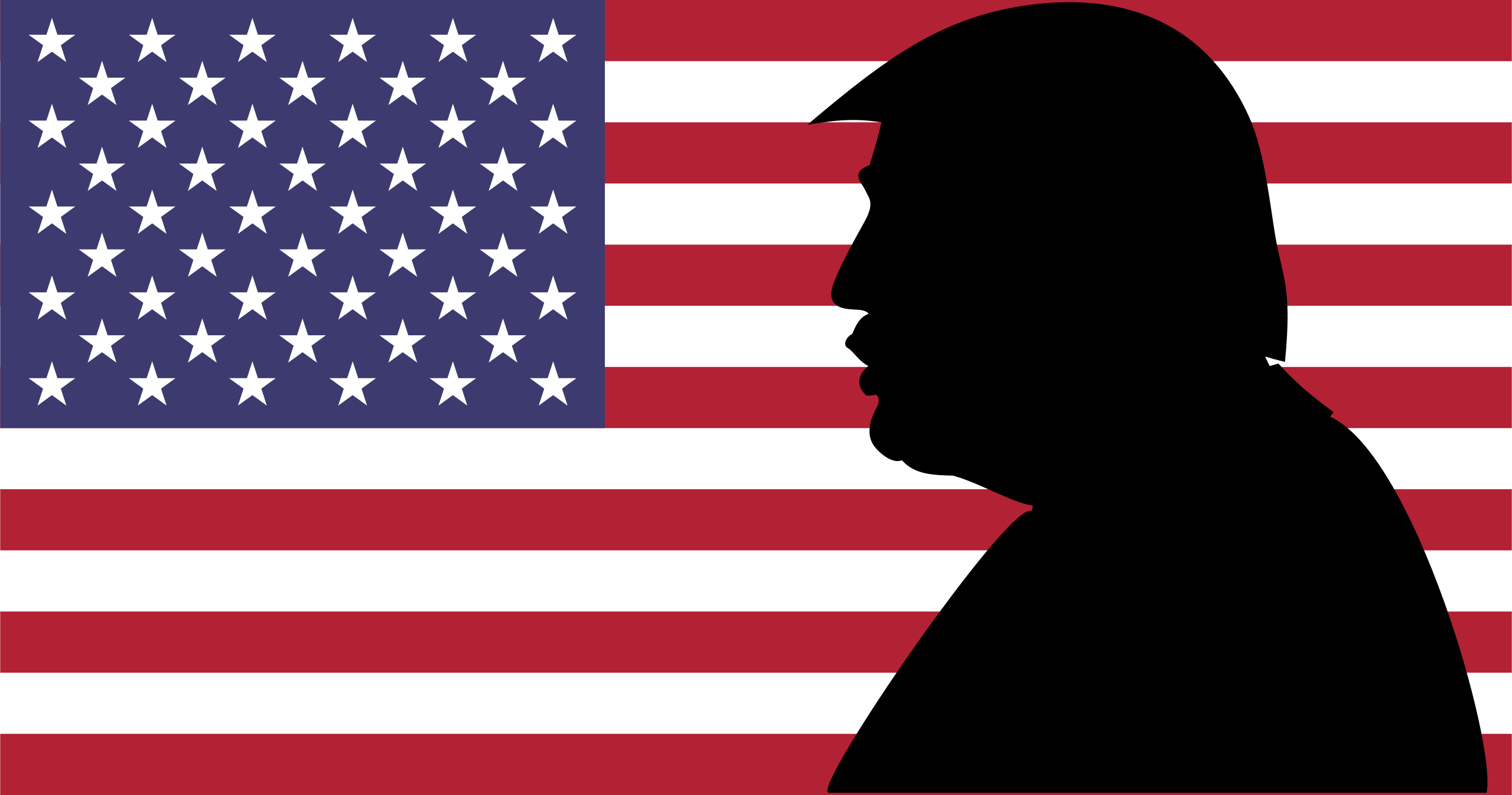 This features a large American flag with the president's silhouette in front of it. The flag is positioned on the left side, while the silhouette of President Trump is on the right side. The flag has 13 stars arranged across its surface, and the silhouette of the president appears to be making a speech or gesture. This image likely represents a political statement or commentary on the current state of affairs in America.