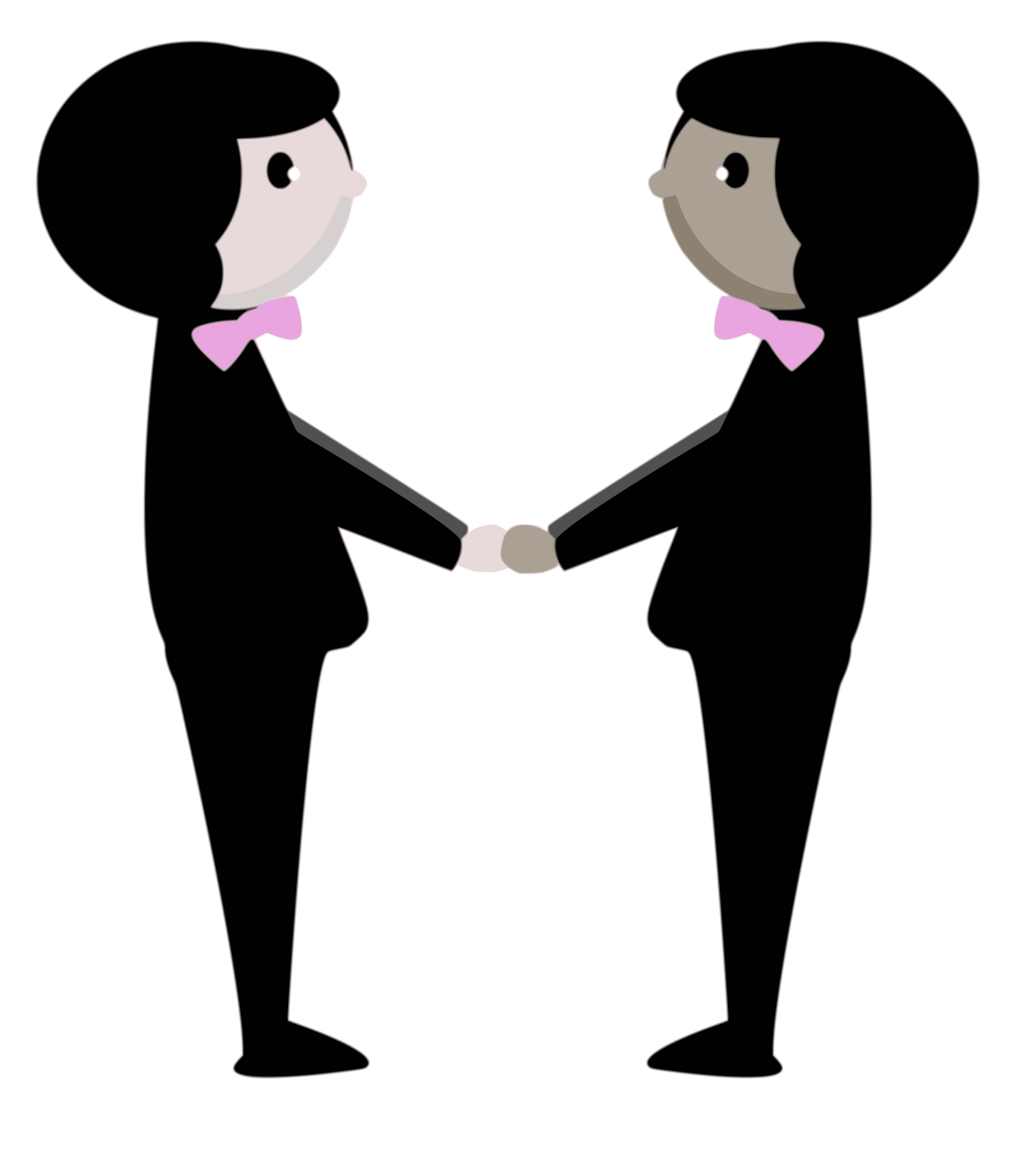 This features two cartoon characters, both wearing black suits and pink bow ties. They are standing next to each other with their hands clasped together in a friendly gesture. Their outfits give them an elegant appearance, and the bow ties add a touch of sophistication to their overall look. The scene appears to be set against a white background, which helps to emphasize the contrast between the characters' suits and the rest of the image. Overall, this illustration captures a sense of camaraderie and connection between the two individuals.