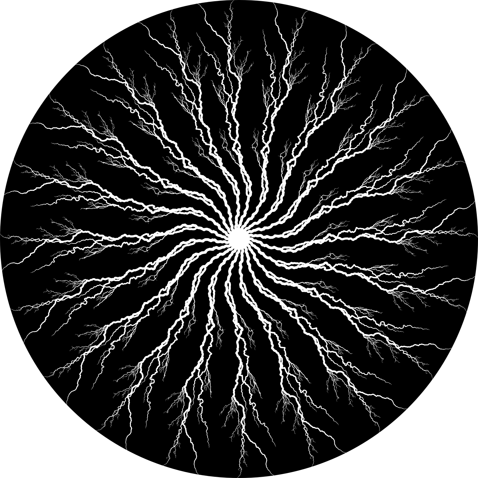 This features a black and white circular picture of an electrical storm. The center of the circle is filled with lightning bolts, creating a striking visual effect. The lightning bolts are scattered throughout the entirety of the circle, with some closer to the edges and others more towards the center. This artistic representation captures the intensity and beauty of nature's electrical display.