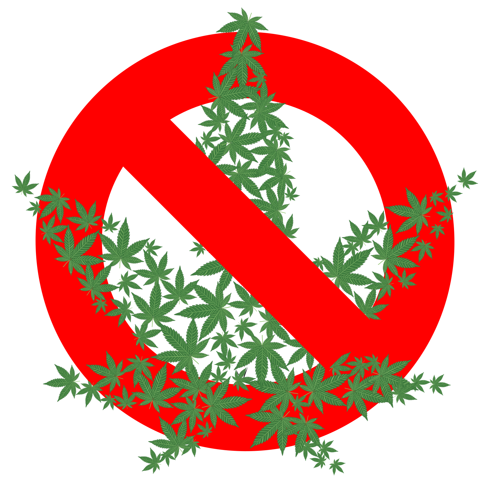 This features a red circle with green leaves and the word "no" written in white. The circle is filled with many small images of marijuana plants, creating an interesting visual effect. These marijuana plants are scattered all around the circle, filling it from top to bottom and side to side. The combination of the red background and the abundance of green leaves creates a striking contrast that draws attention to the image.
