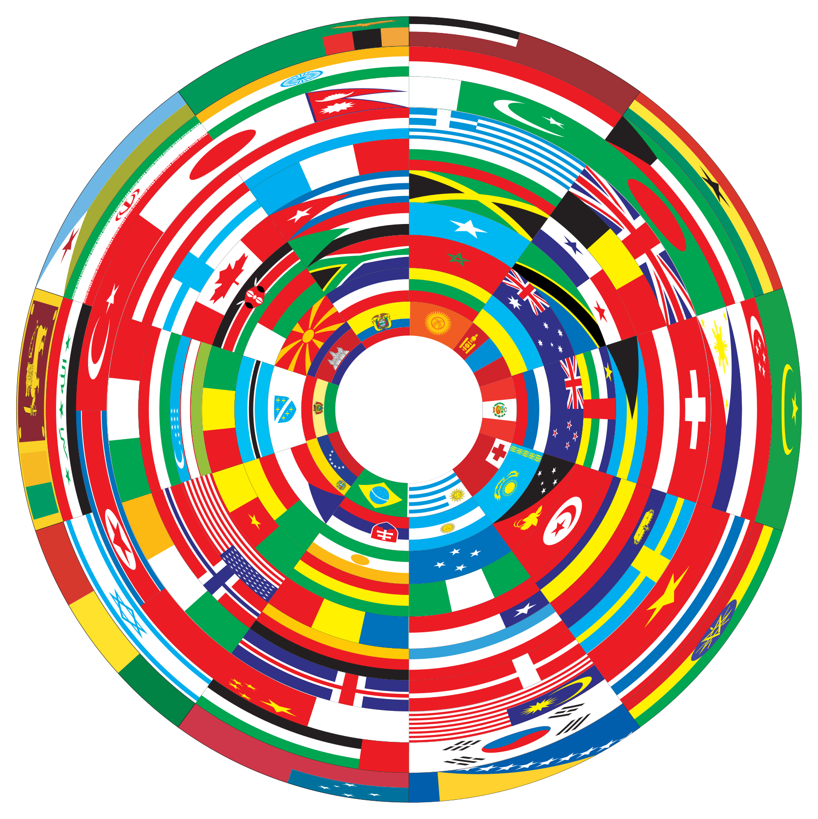 This is a colorful circle made up of many different flags from various countries. These flags are arranged in such a way that they form the outer edge of the circle, creating an interesting and visually appealing design. There are at least 13 distinct flags visible on the circle, each representing a unique country or region. The arrangement of these flags creates a sense of unity among different nations while also showcasing their individuality through their respective flag designs.