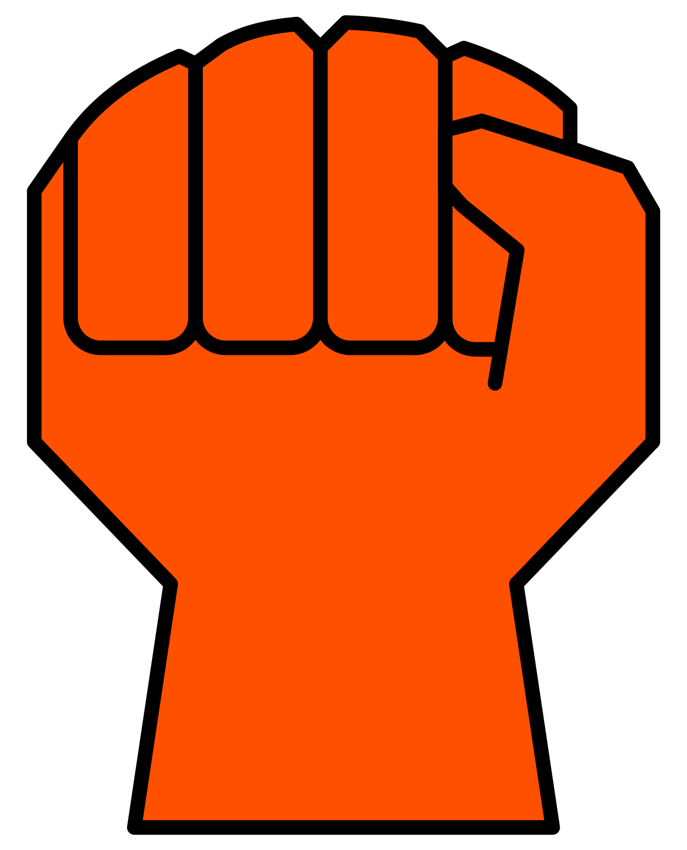 This features a large, red fist symbol with an orange background. This symbol is often associated with the concept of solidarity and unity among people. The vibrant color of the fist makes it stand out against the orange backdrop, drawing attention to its message. The bold design of the fist can be used in various contexts, such as political or social movements, to represent a unified front against oppression or discrimination.