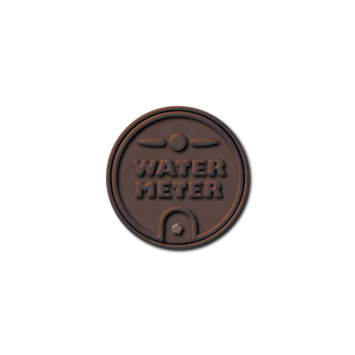 This features a brown water meter cover with the words "Water Meter" written on it. The cover is made of metal and has a hole in the center, which allows for easy access to the water meter inside. The design of the cover gives it an old-fashioned appearance, adding character to its surroundings.