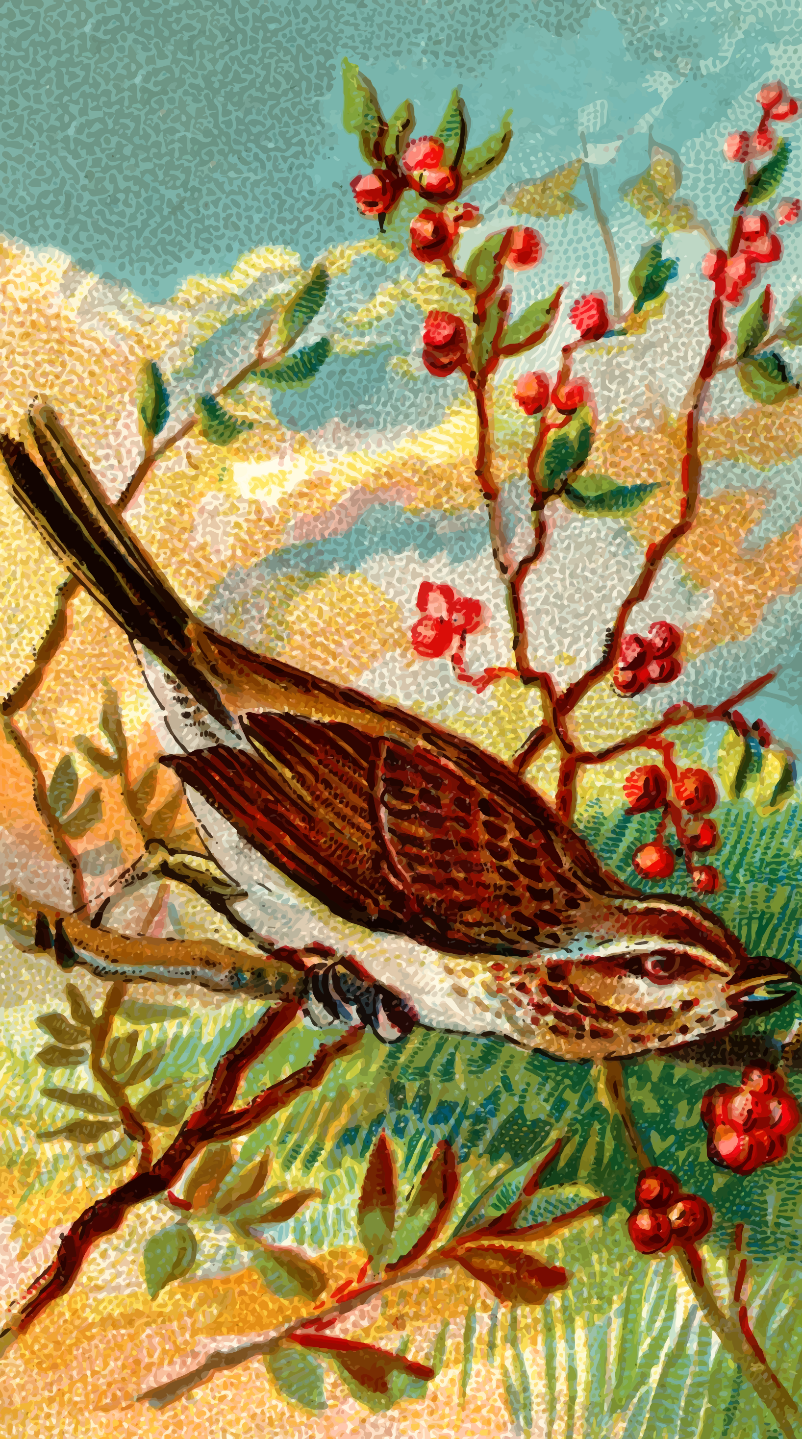 This features a small bird perched on a branch with red berries. The bird is surrounded by several red berries, some of which are close to it and others further away. The scene appears to be set in an outdoor environment, possibly during the daytime. The bird's position on the branch suggests that it might be resting or searching for food among the berries.