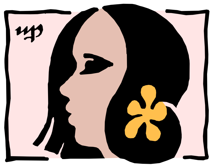 This features a woman with dark hair and an earring. She is wearing a yellow flower in her ear, which adds a pop of color to the scene. The drawing itself appears to be a silhouette, emphasizing the shape and form of the woman's face and body. The overall composition creates a visually striking image that captures the viewer's attention.