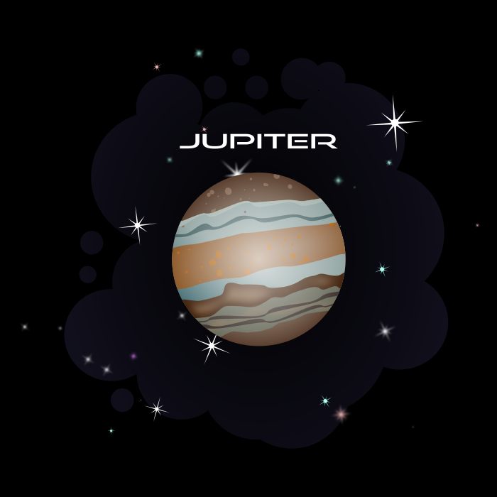 This features a black background with a large, colorful planet Jupiter taking center stage. Surrounding the planet are numerous bright stars of various sizes and colors, creating an eye-catching display. Above the planet, the word "Jupiter" is written in bold letters, emphasizing its importance within the image. The combination of the vibrant colors and the celestial theme make this a visually appealing and informative piece of artwork.