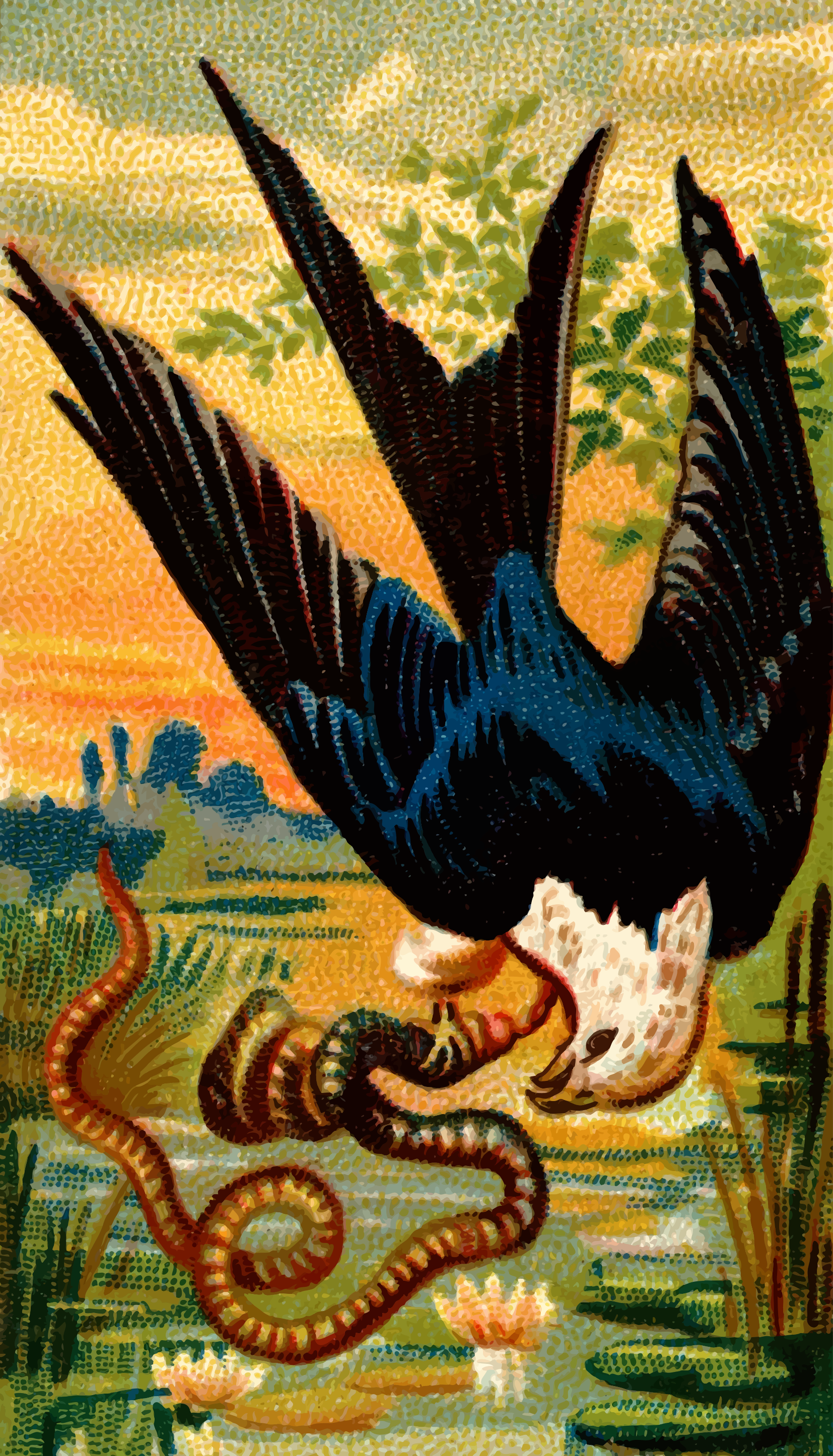 This features a large bird, possibly an eagle or a hawk, with its wings spread wide. It is perched on top of a snake that it has caught in its grasp. The bird appears to be holding the snake down as if it's about to eat it. The scene takes place near a body of water, which adds to the natural setting of the image.