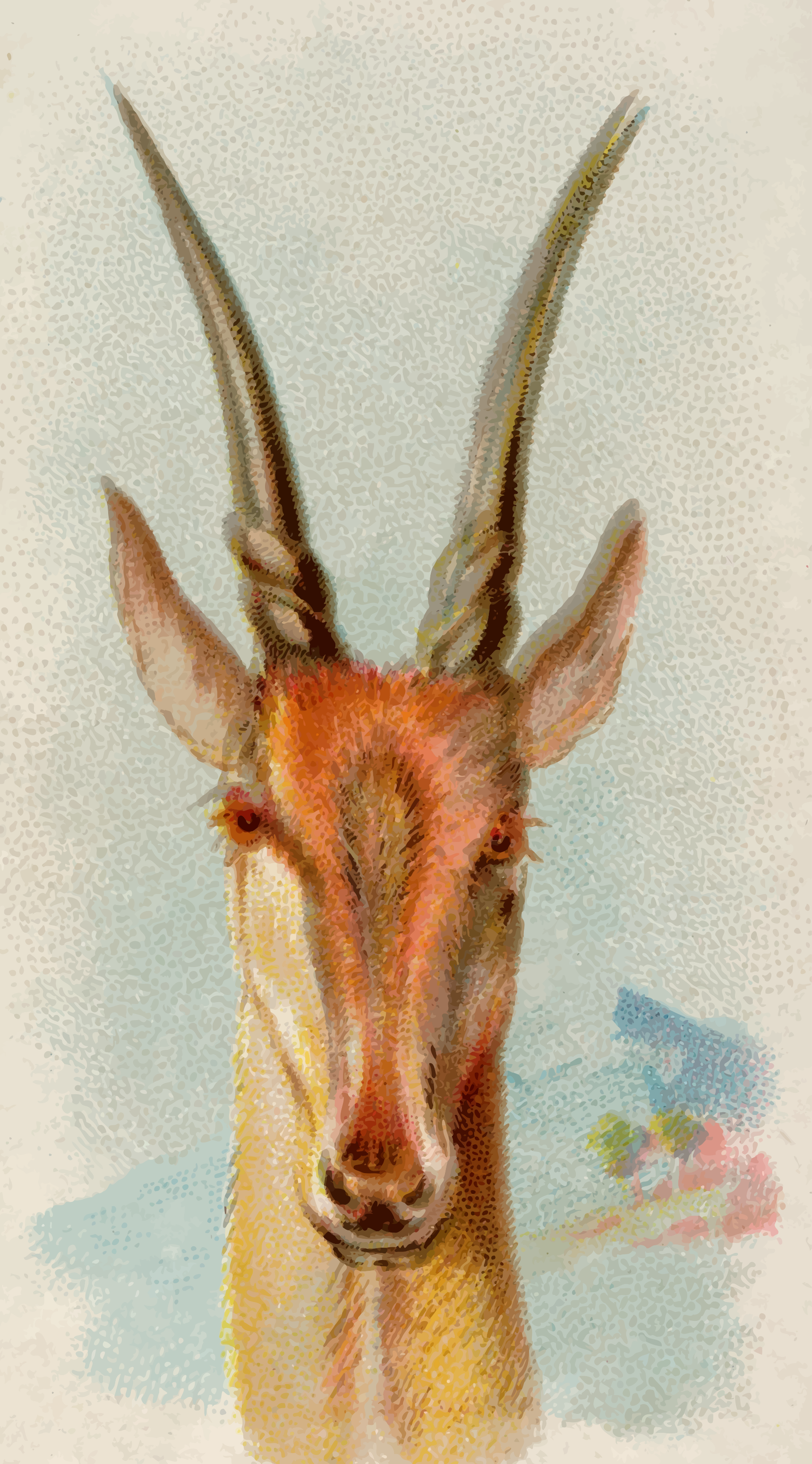 This features a large, horned animal with long hair and a distinctive appearance. It is standing in front of a house or building, possibly on a farm or ranch. The animal's head is turned to the side, giving it an interesting expression. The scene appears to be a painting or drawing, as the animal seems to be posing for the picture. The overall atmosphere suggests a connection between nature and human-made structures in this particular setting.